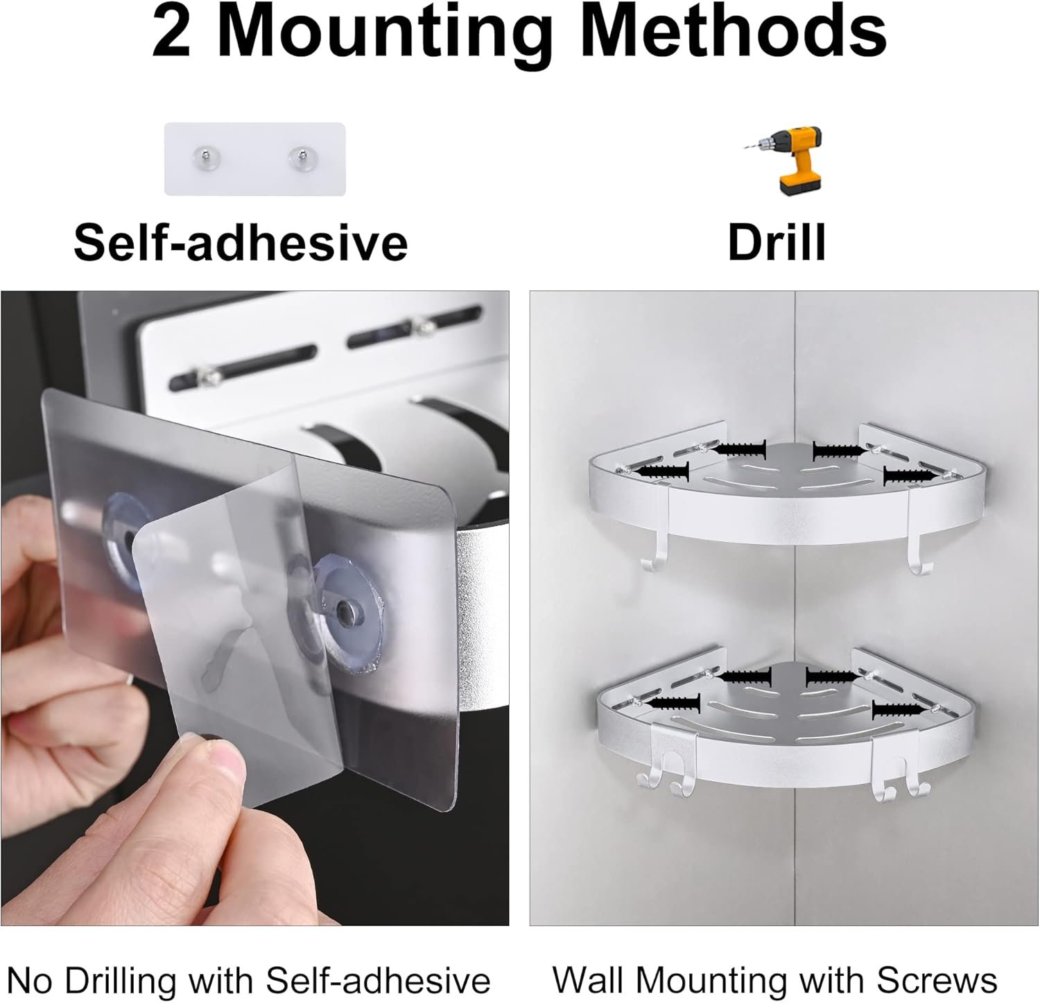 【No-Drilling Easy Installation】The bathroom caddy uses adhesive installation, won’t damage your wall, and requires no tools.Can be installed in just few minutes.We also provide screws for you, in case you want to install them with screws.