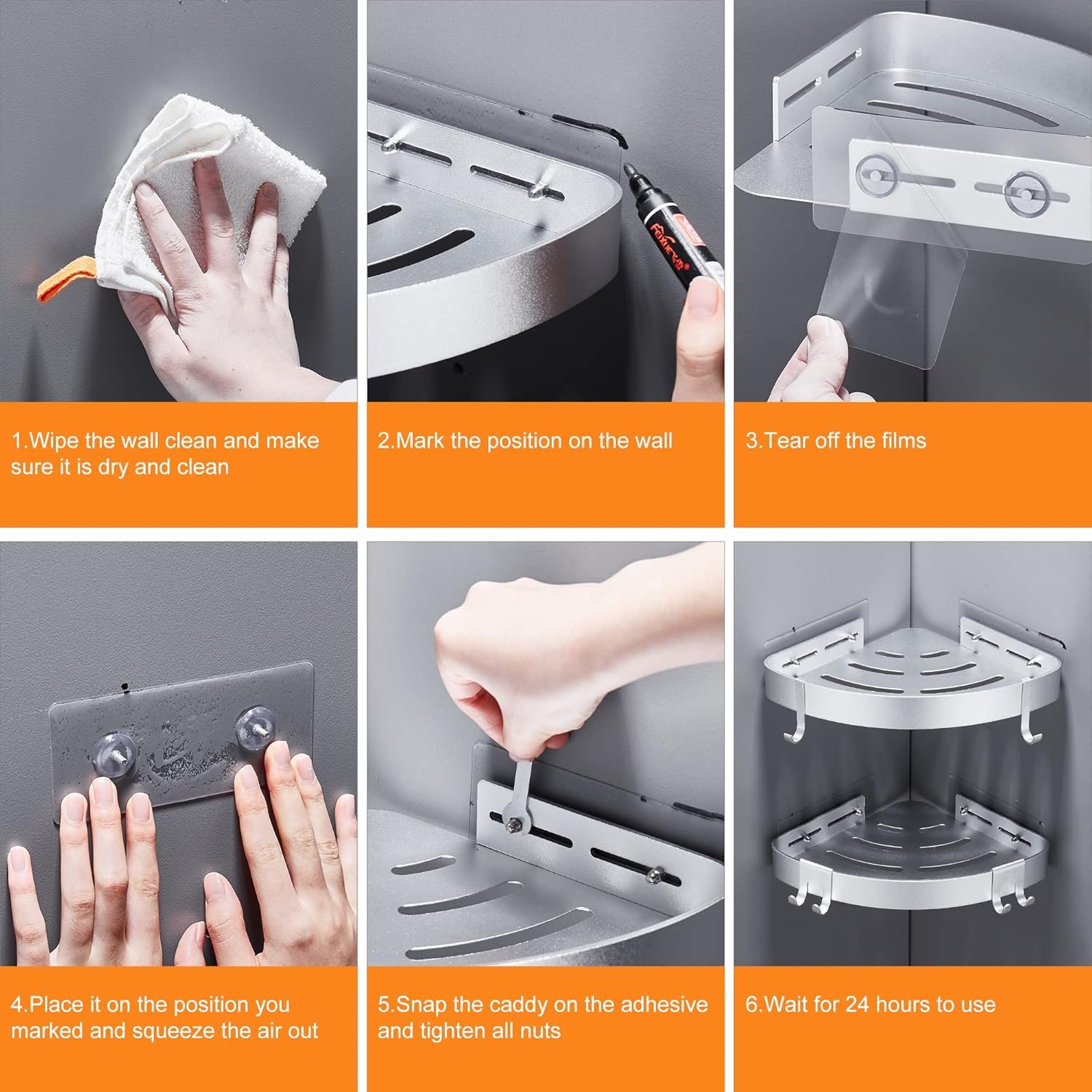【Suitable for a variety of surfaces】The shower racks for inside shower can be stick on various smooth and clean walls, such as smooth ceramic tiles, tempered glass, marble, metal surfaces, etc. You have to use screw installation on rough walls, such as wallpaper walls, cement walls, lime walls, and painted walls.