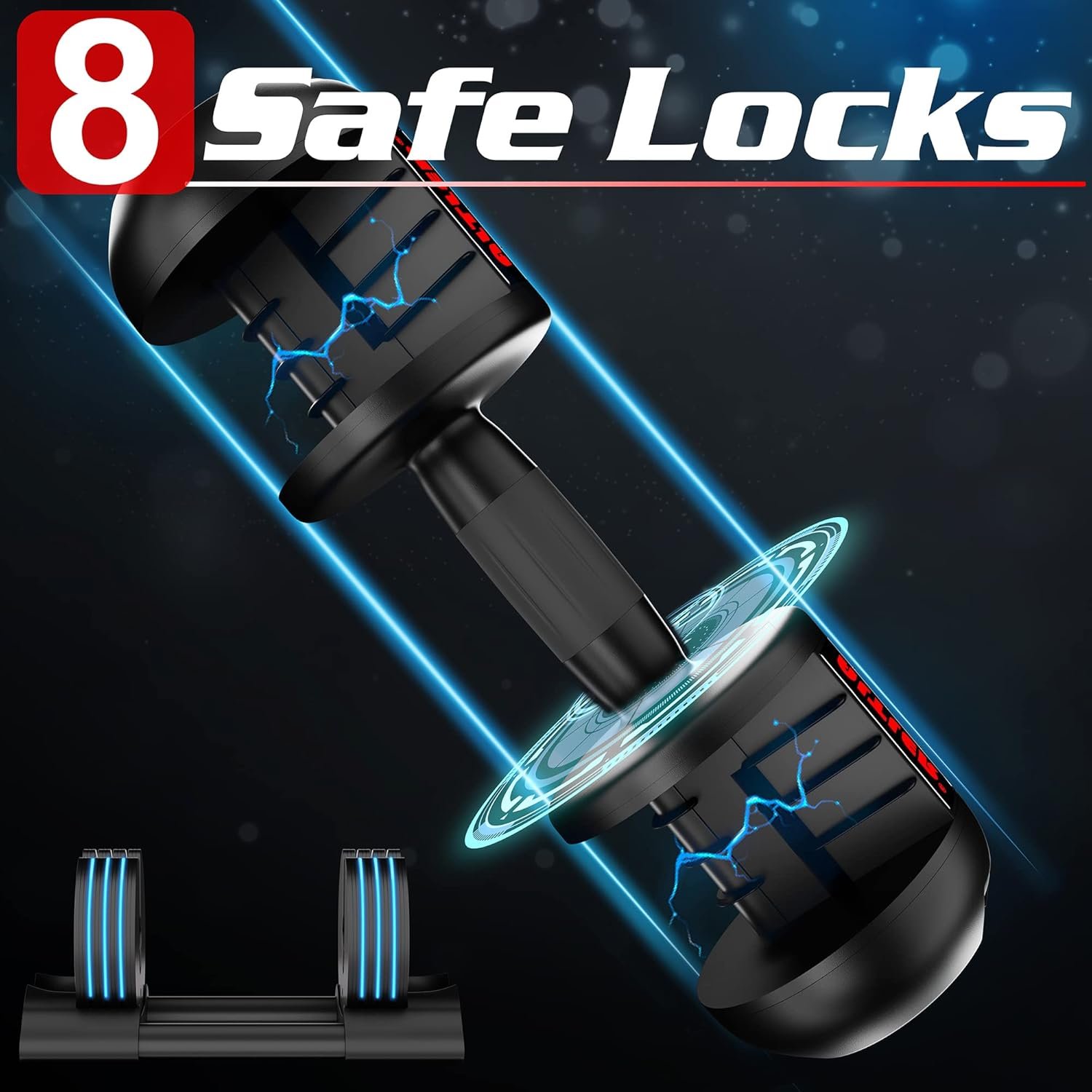 Safe Locking System- We are applying a strong structural and 100% safety ensured lock system both on the counterweight and on the tray, which ensure the dumbell set are fastened stably and tightly to ensure your safety. No more weight plate fallen off during exercise