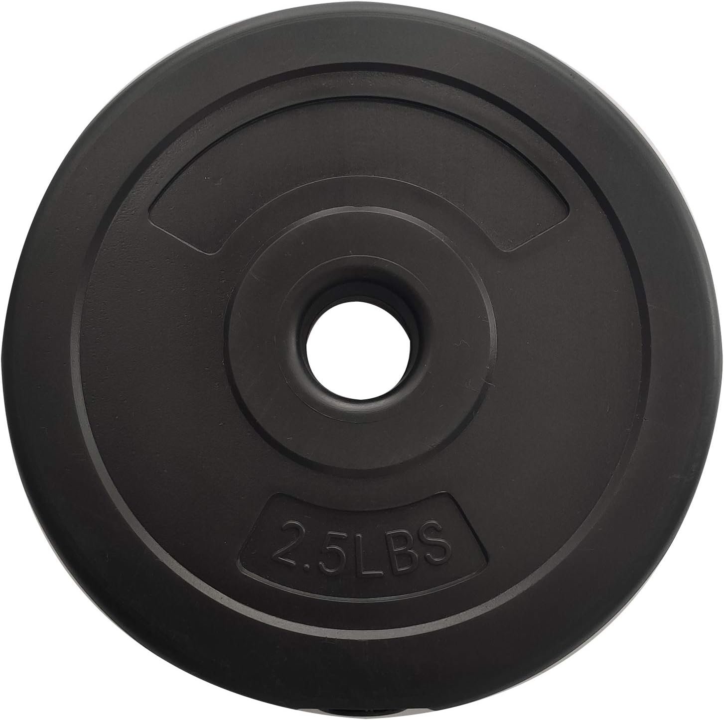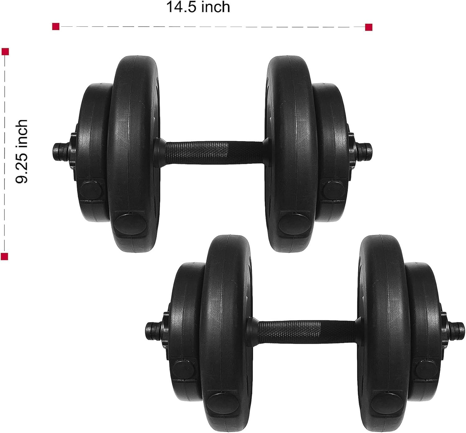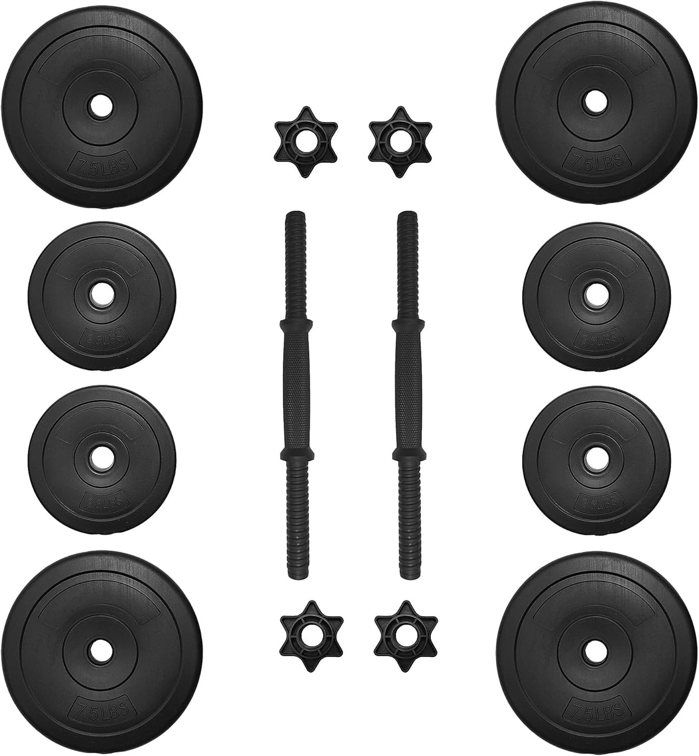 What’s included: 4x 2.5 lbs and 4x 7.5 lbs vinyl cement plates, 2x 14″ dumbbell handles and 4 collar locks