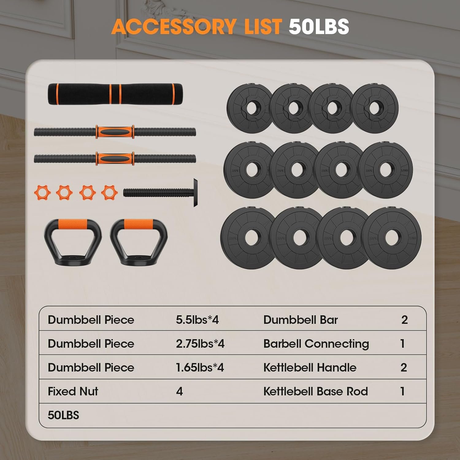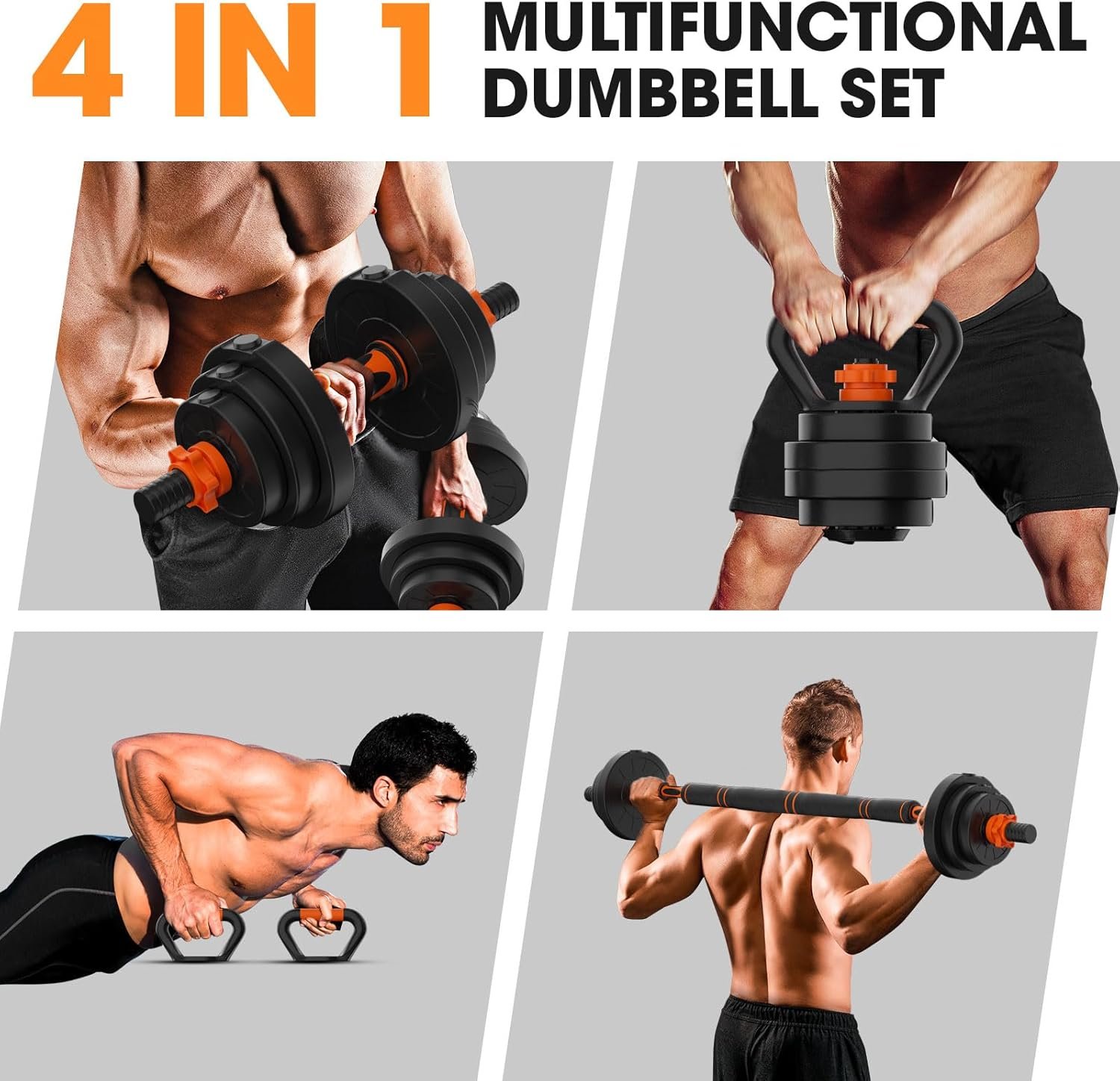 【4 in 1 Multifunctional Dumbbell Set】With the adjustable dumbbell set, it can boost your home workout level. Easily transform it into dumbbells, barbells, kettlebells, and push-up bars, switch exercise modes as you like. A 4-in-1 dumbbell set can meet your home gym needs and enjoy multi-faceted fitness