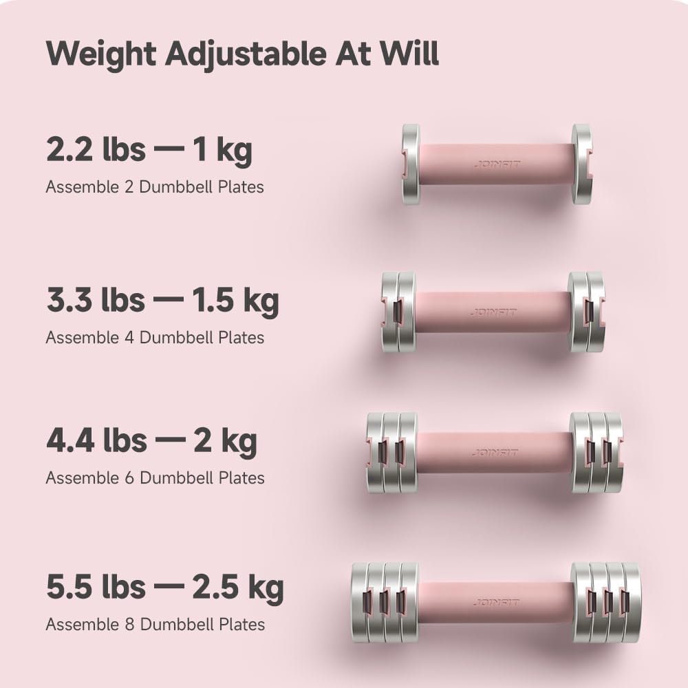 Innovative Adjustable Design: these adjustable dumbbells offer a versatile solution for effective workouts.Weight from Original weight 2.2lb, adjustable from 2.2 to 5.5 pounds (≈0.55 pounds per accessory,1.1 pounds a pair)