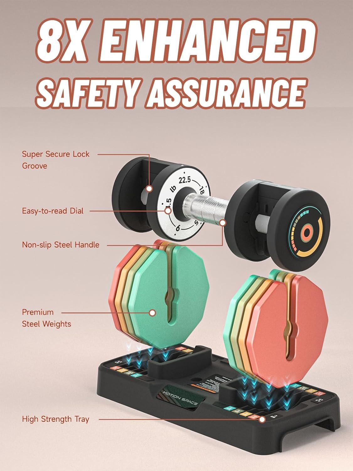 š„ćSAFETY DESIGNćWith its innovative count weight plate design, it easily adjusts the weight by holding the handle and turning the pointer to the desired number. Our latest design includes 8 locking mechanisms, providing stability and ensuring safety during workouts.