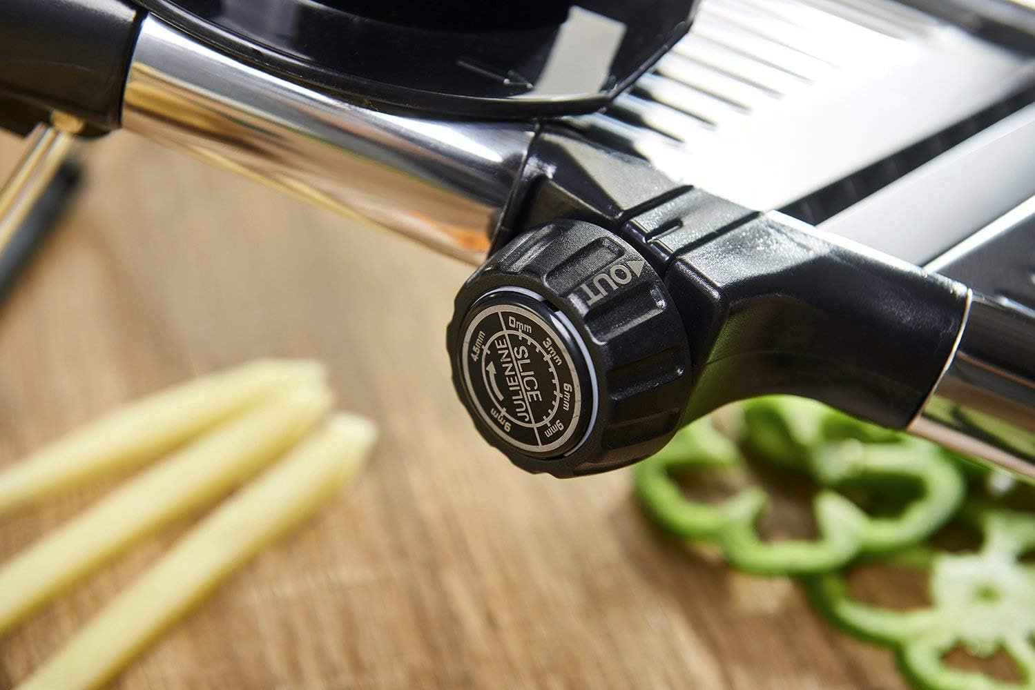 STRONG BODY AND WORKS PERFECTLY : The French fry slicer is made of Japanese 420J2 stainless.Just adjust the knob, then you can choose almost 0mm-9mm slices and 4.5mm & 9.mm julienne with the sharp blades. The adjustable mandoline slicer allows thinner slicing as you want.