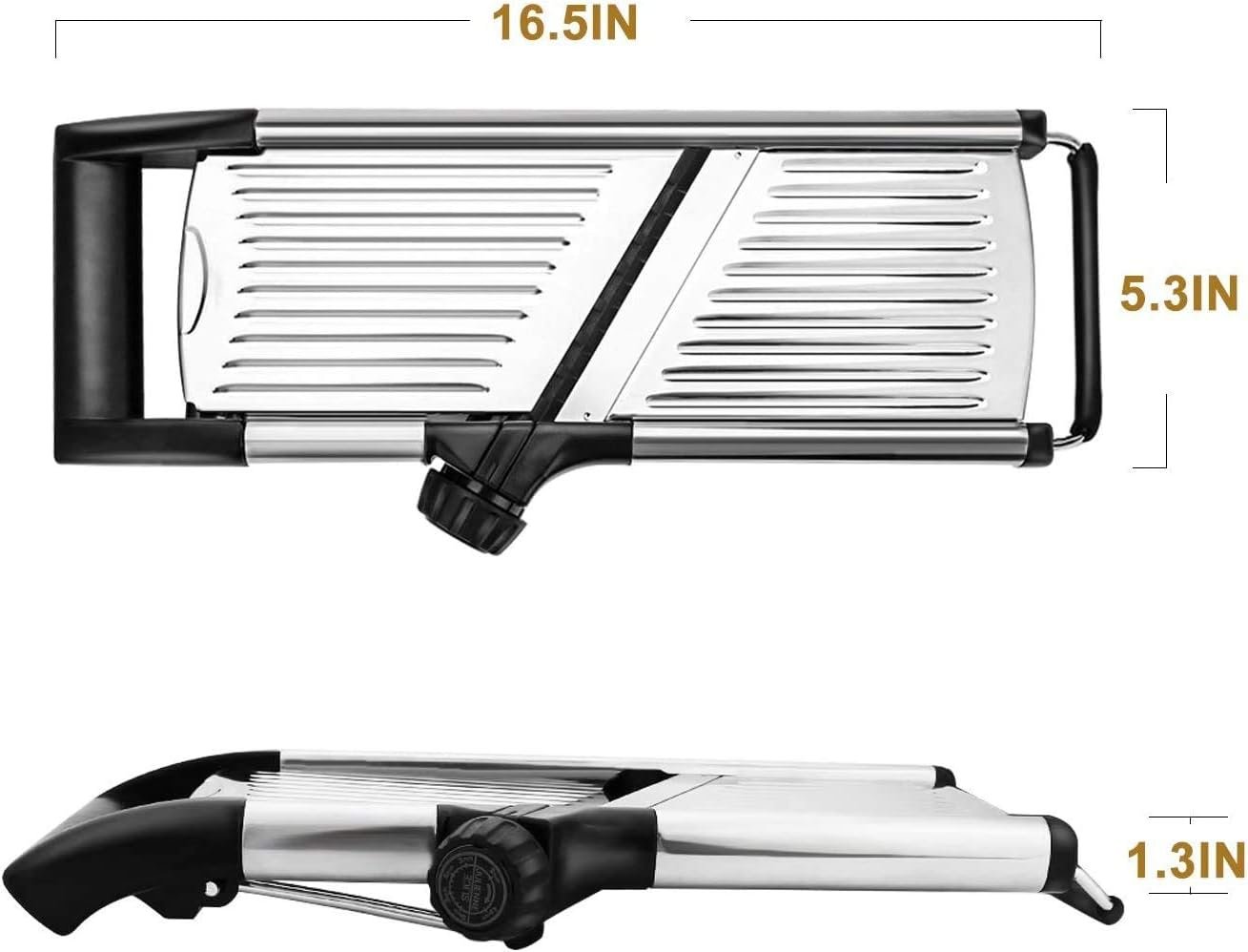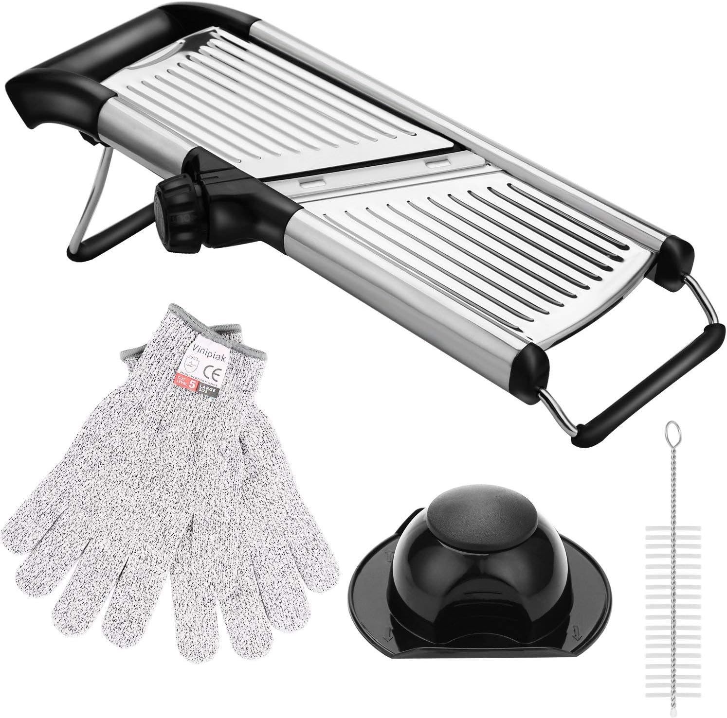 OUR MANDOLINE SLICERS ARE SAFE : As we know, many people will cut their fingers when they use other adjustable mandolins, because the blades are very sharp. But our vegetable slicers are safe. When you are slicing, the hand holder will protect your hands from touching the blades. And we add FREE cut-resistant GlOVES(cut level 5) with the stainless steel mandoline. The blade will come with the blade guard. Your safety is the most important.