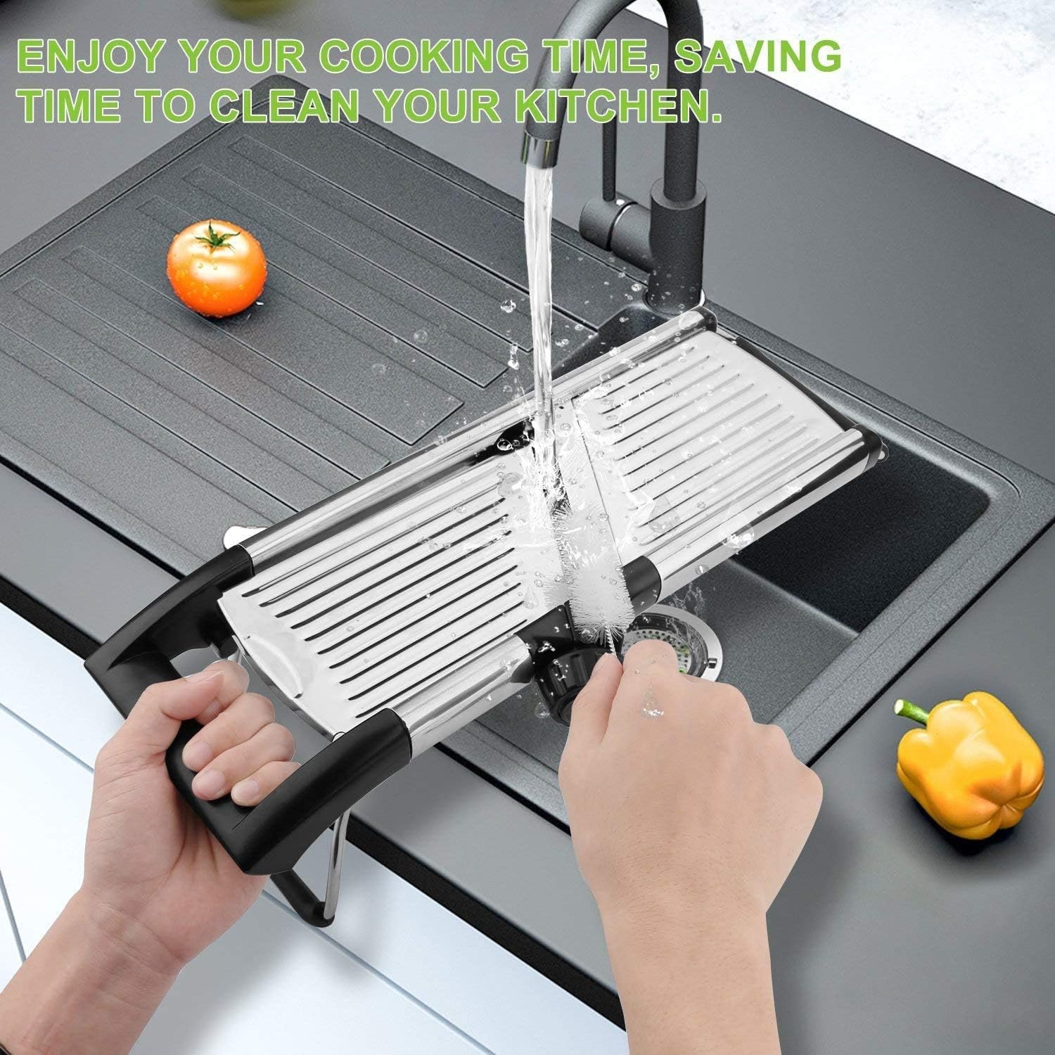 SAFELY CLEAN & SPACE SAVING DESIGN : We add a FREE BRUSH with the hand held mandoline in order to clean the blade safely and easily with water. The blades are convenient built-in blades and the no-skid base are foldable. So it does not need much space when you store the vegetable slicer in the kitchen.