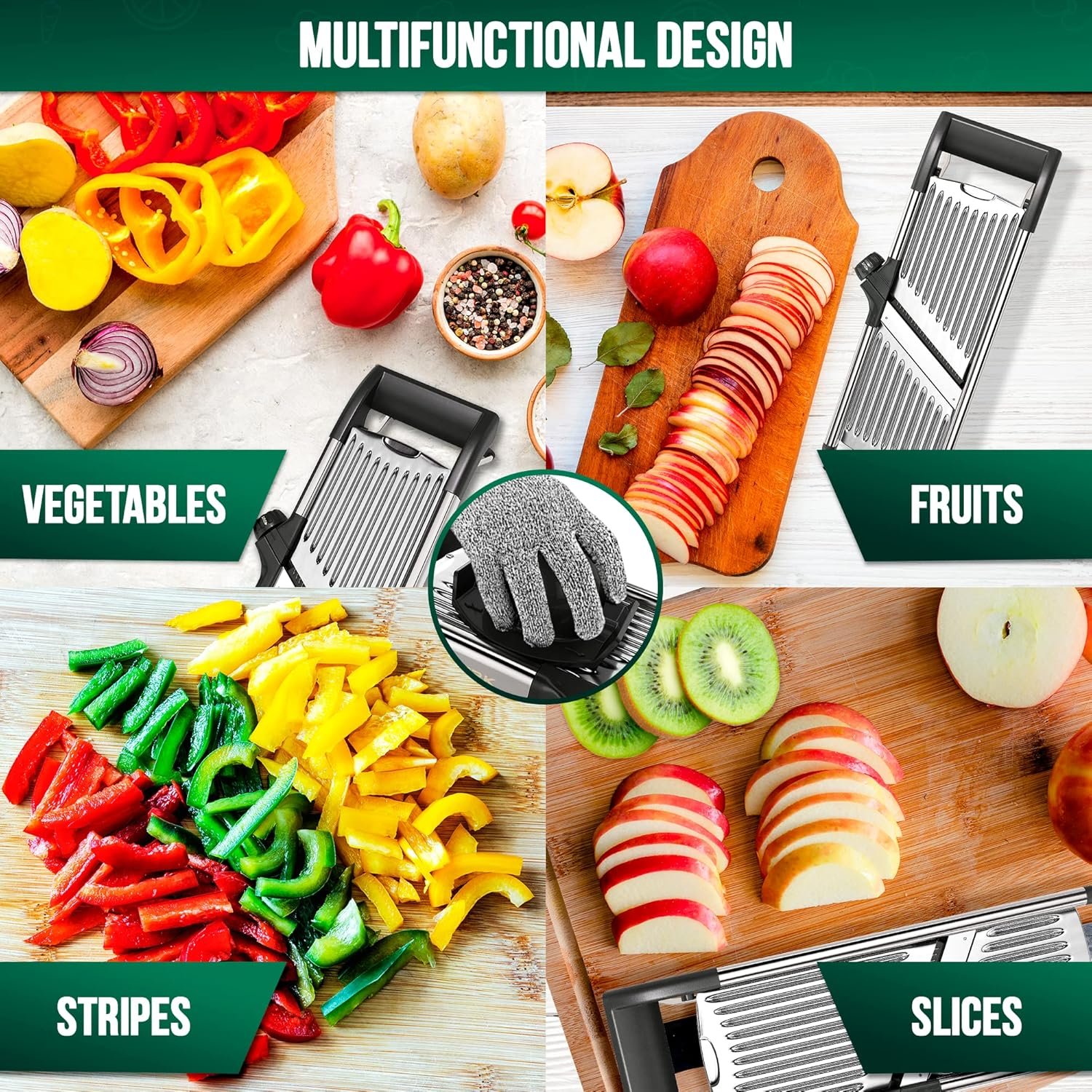 [SAVE YOUR TIME] Spend less time in the kitchen and more time enjoying meals with loved ones. Our slicer significantly cuts down on prep time, allowing you to focus on what matters most. Whether you’re preparing a classic American comfort food or trying out a new fusion recipe, our slicer adapts to your needs with its adjustable blades and slicing options. Give your dishes skill and ease.