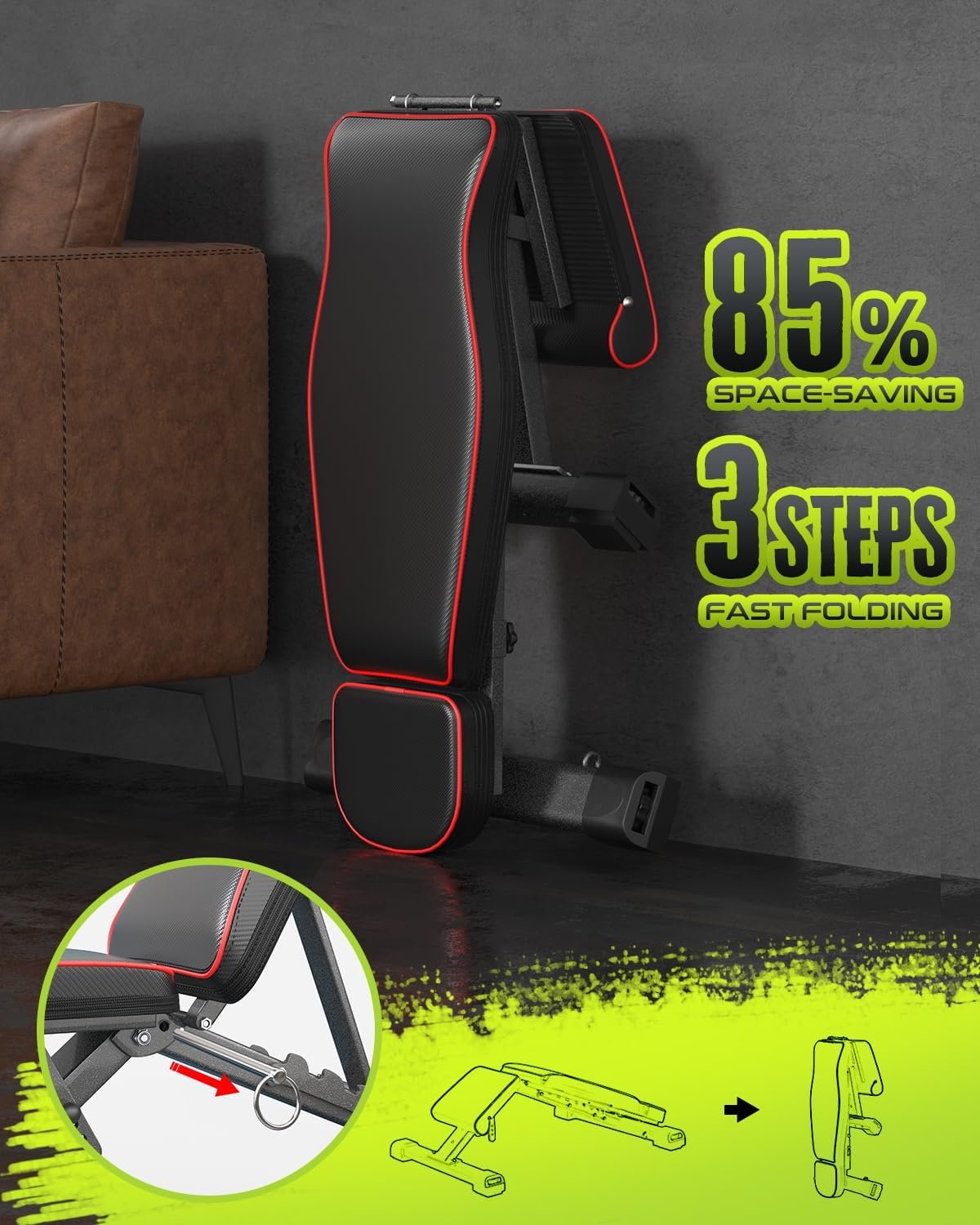 Fold in 3 Steps, Save 80% Space: Foldable Weight Bench well suited to home gym, portable shape can be stored virtually the wall or in a closet for saving your home space