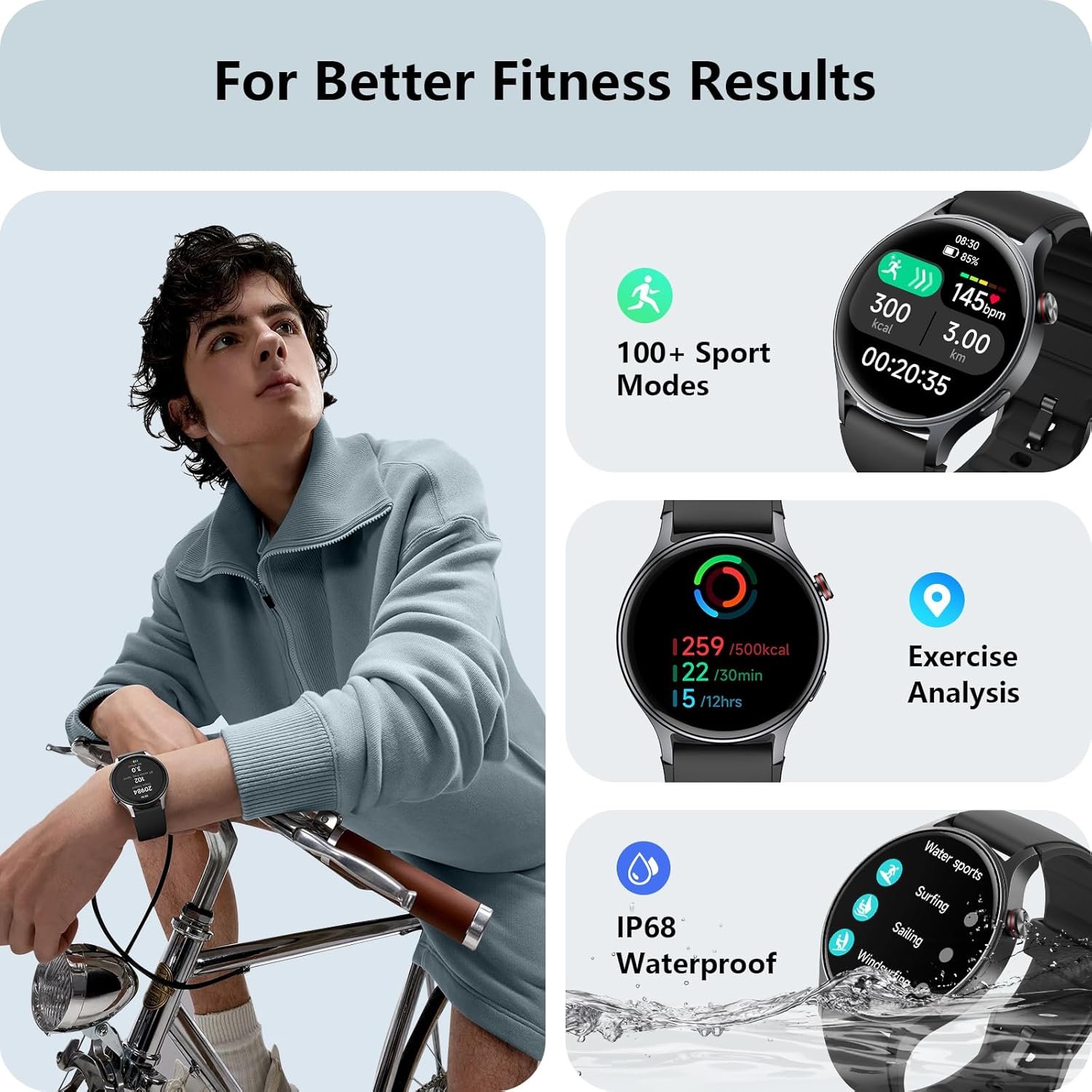 【110+ Sports Modes & Waterproof】With 110+ sports modes, this fitness watch supports a wide range of activities, from yoga to swimming. Its 3ATM water-resistant design ensures reliable performance in wet conditions.