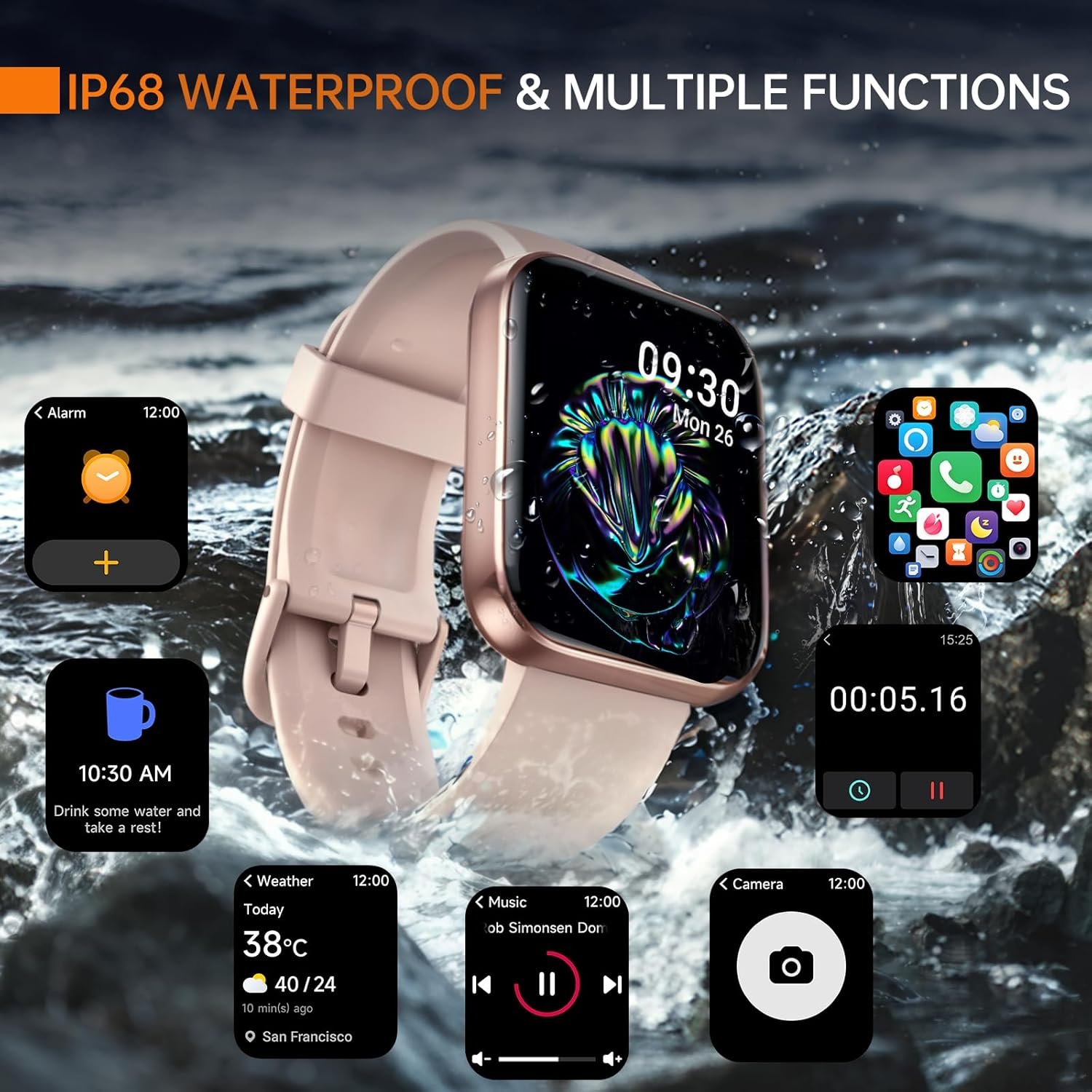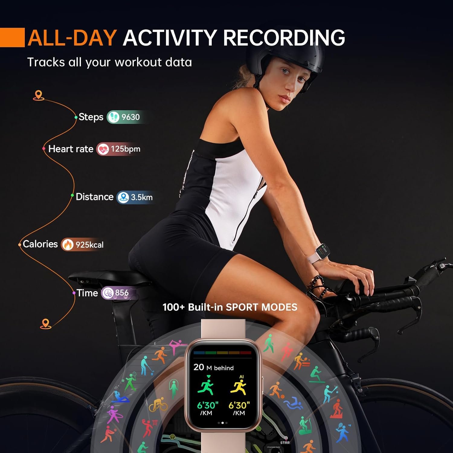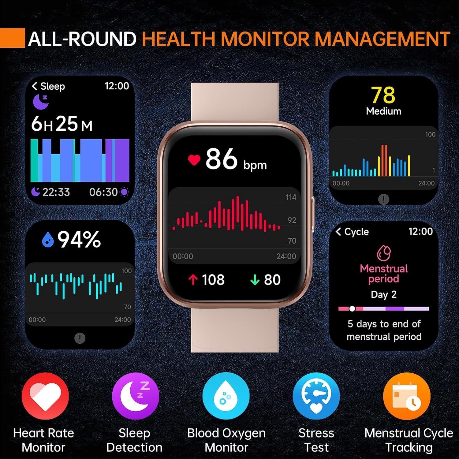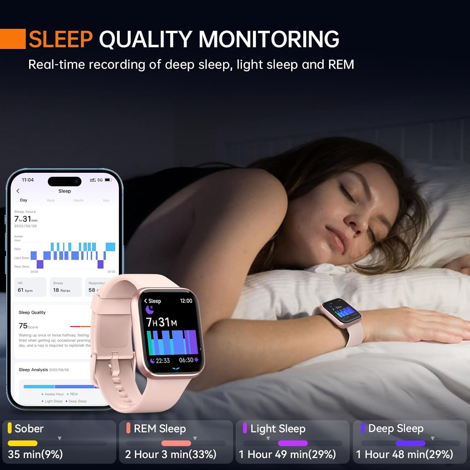 🩺 【Heart Rate/SpO2/Stress/Sleep Monitor】 The smartwatch has advanced sensors that help you detect 24-hour continuity real-time Heart Rate, Blood Oxygen (Sp02), Stress and Sleep Monitoring(Deep/light sleep). All recorded data can be synced to your phone for analysis, providing valuable insights into your health and facilitating lifestyle adjustments.