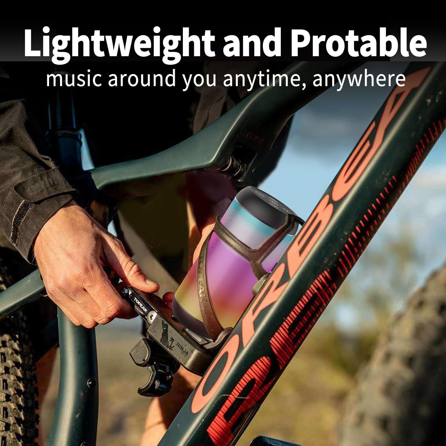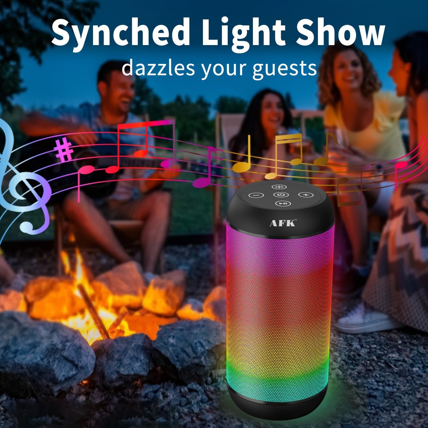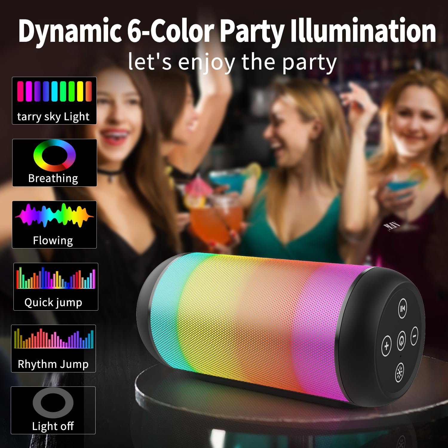 【Music with Dynamic Lights】The portable bluetooth speakers features built-in with 5 RGB light colors and 6 light modes, mixed color flashes that sync with the beat, create a vibrant and immersive audio experience.