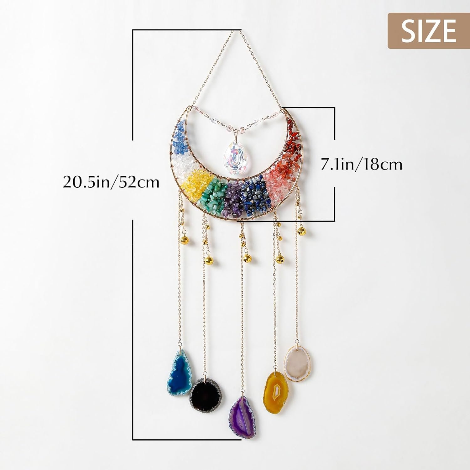🌙【Original Design Inspiration】:7 chakras Gemstones were woven into a leafy Inverted moon shaped life tree by metal wire,A small crystal ornament hung above it,agates and small bells as pendants under it ,heralding the tree is spreading branches leaves and nurturing life,lucky and positive. Meanwhile,natural agate stones have certain energy and magnetic field, which can used as talismans that absorb negative energy and avoiding evils, give spiritual pleasure&inspiration,bring good luck to you