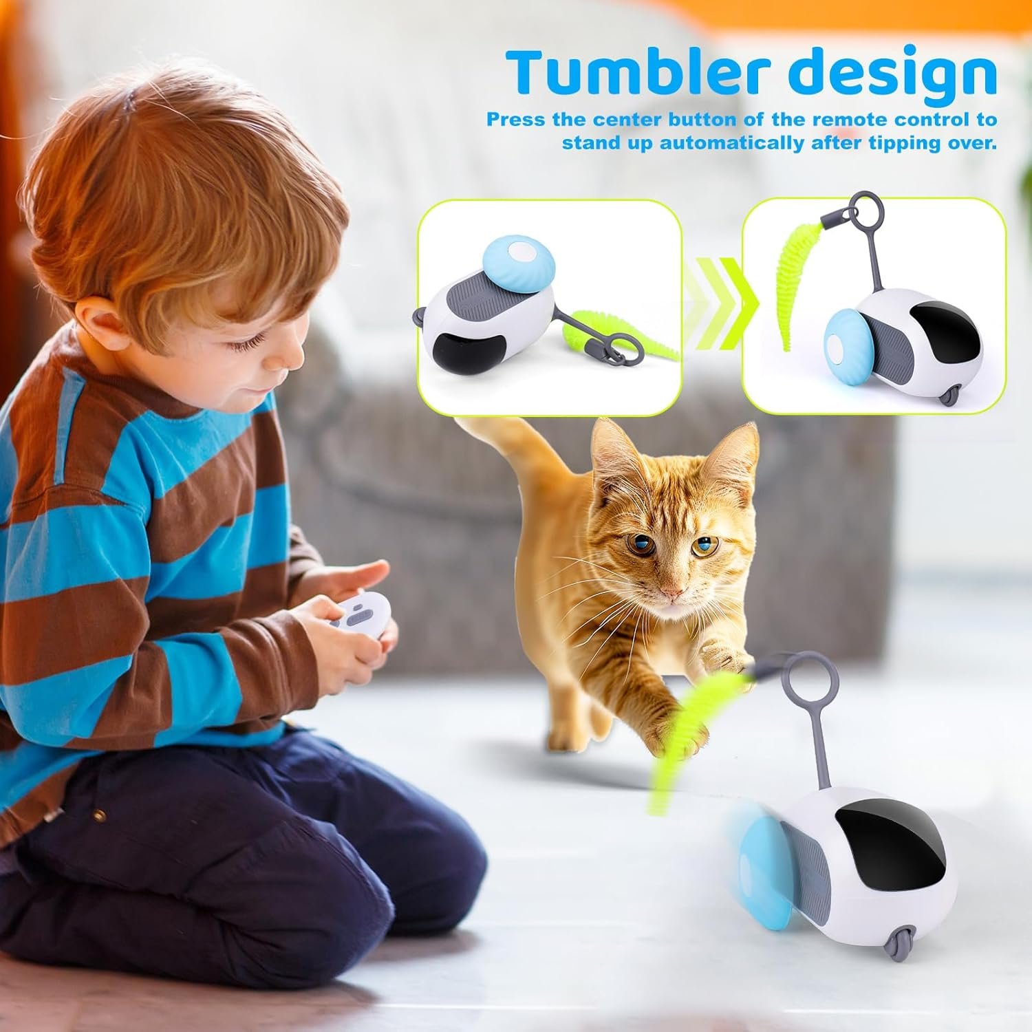 Tumbler design: Are you still troubled by the toy falling over and needing to walk over to pick it up and place it upright before it can operate again? Our smart cat toy has undergone a brand-new upgrade. By pressing the button in the middle of the remote control, you can make the fallen-over cat toy stand up and move again. The effective range of the remote control is 15-20 meters, so you don’t have to worry about not being able to control the cat toy while playing and interacting with cat