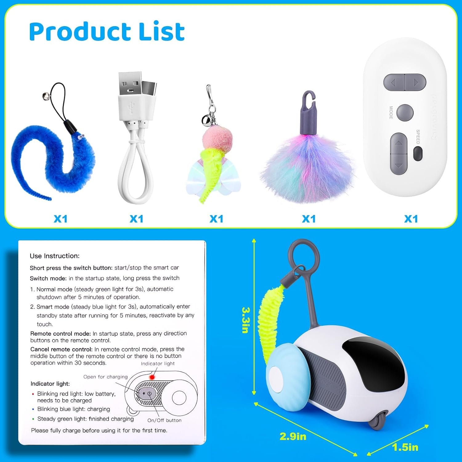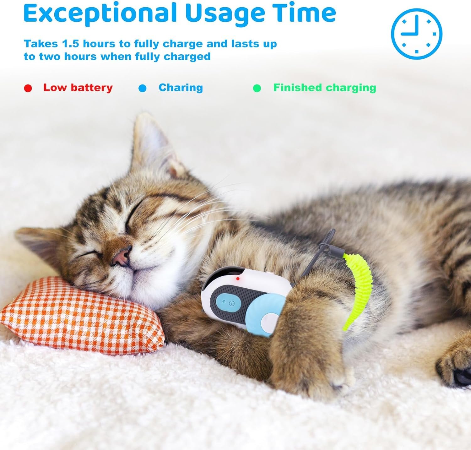Warm Tips:Under normal mode (green light is always on for 3s),it will run for 5 minutes and turn off automatically,under smart mode (blue light is always on for 3s),it will run for 5 minutes and enter standby mode,the cat will move again when it touches,note that the remote control can be controlled in any mode.It takes about 1.5 hours for the cat toy to be fully charged,and it can exercise for 3 hours under full charge.