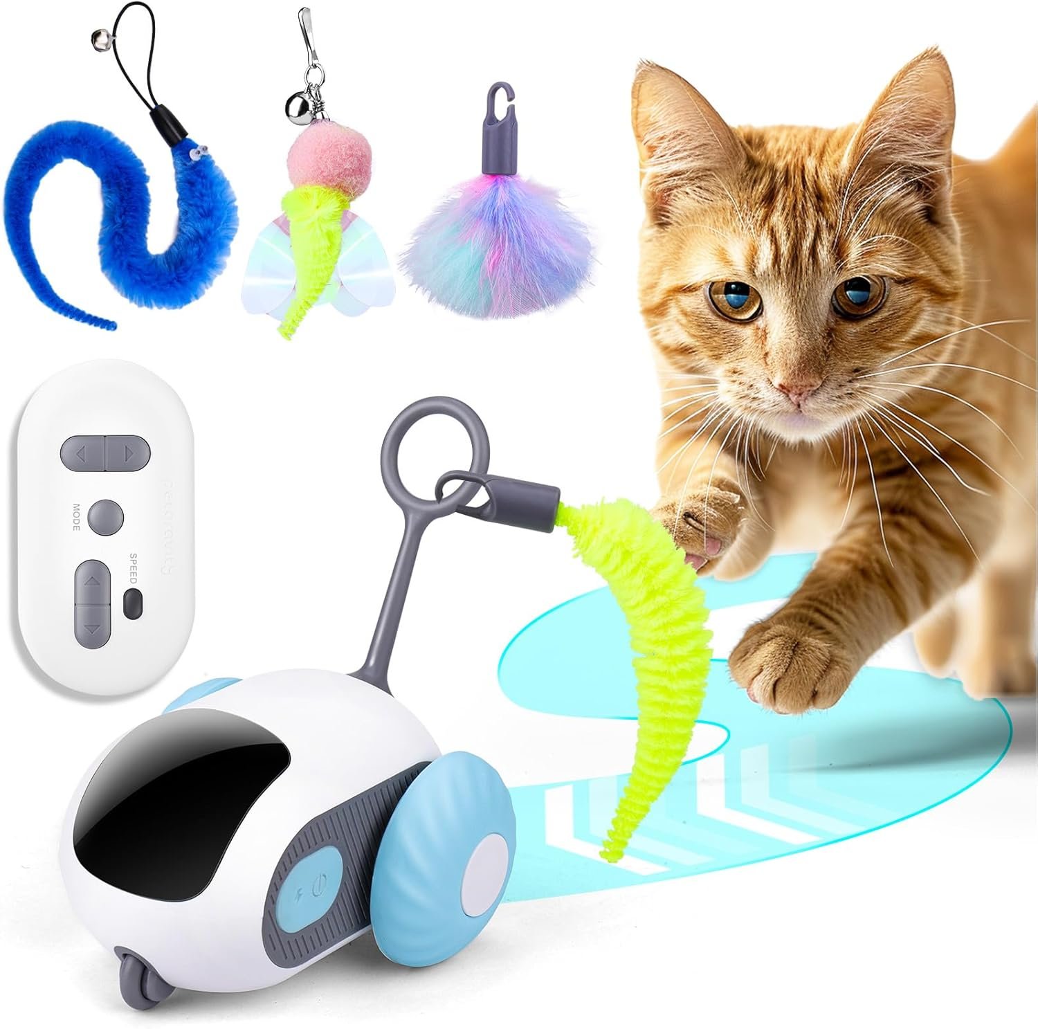 Safe Material: Since cats love to bite, chew and lick toys, our remote control cat toys are made of high quality silicone to ensure durability and safety, cats can’t bite through it to ensure the safety and health of cats, the smart cat toys can also be free to move on surfaces such as wood floors, tiles, hardwood floors, or thin carpets, and the removable silicone wheels are designed to not only be easy to clean, but also don’t have to worry about the wheels being tangled in the hair.