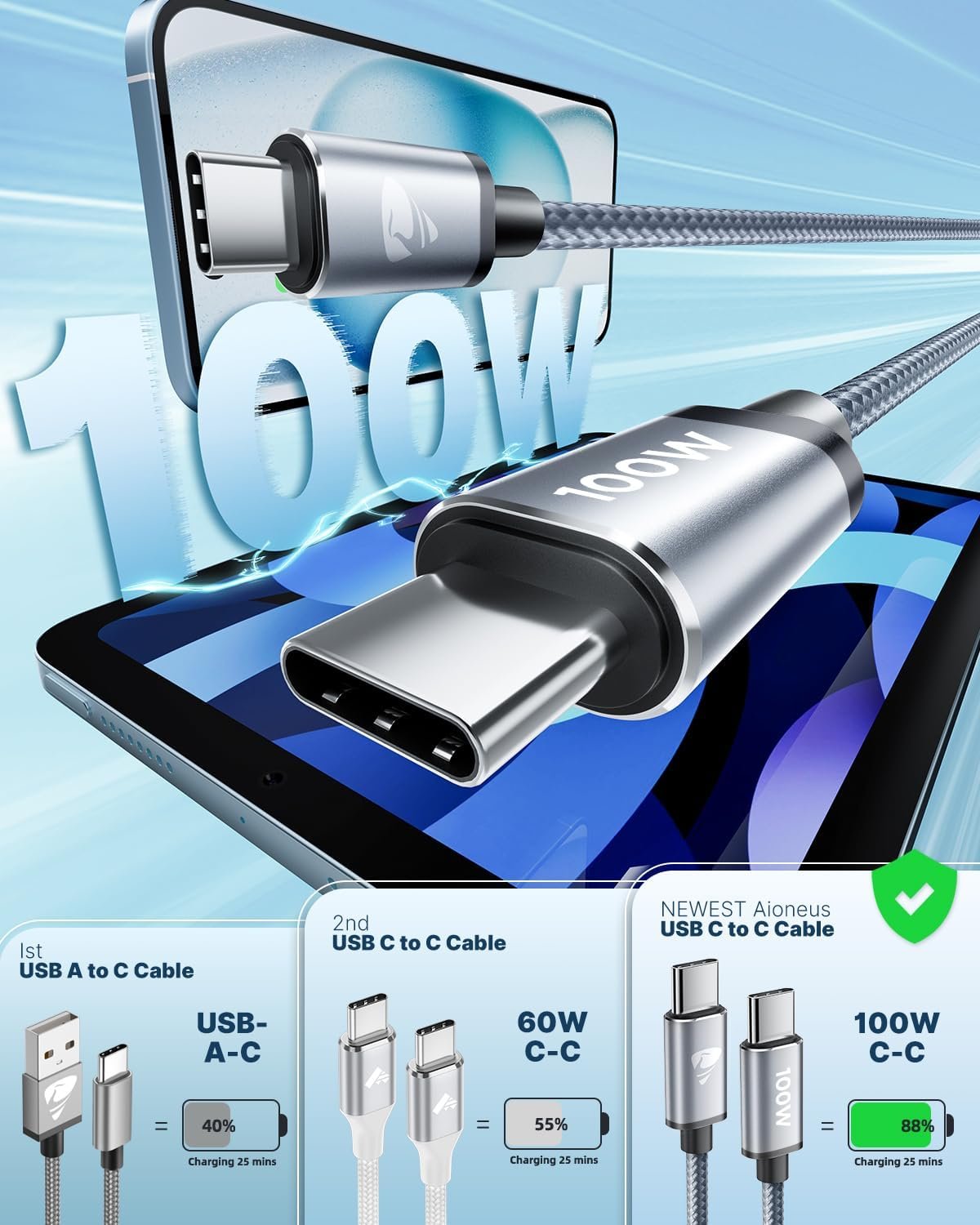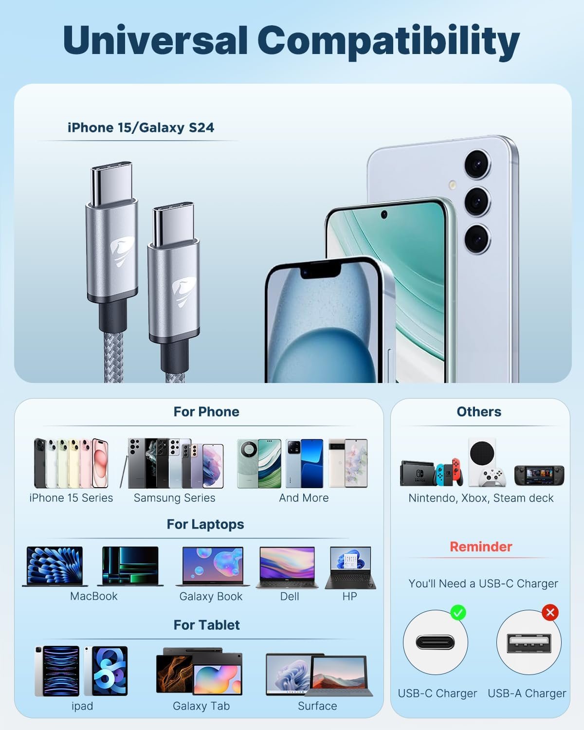 Universal Compatibility:USB C to USB C Cable 100W Compatible with iPhone 16/15/15 Plus/15 Pro/15 Pro Max; MacBook Pro 13 inch, Macbook Air 13 /m1 Inch, MacBook 12 inch; iPad Pro 12.9/11 inch, iPad Air 4/5, iPad Mini 6; Google Pixel 8 Pro/7/6/6 Pro/5/5a; Samsung Galaxy S24/S24+/S24 Ultra/S23/S22/S21/S20, Galaxy A53/A73/A71, Note 10/10+/20 Ultra and other USB-C port devices