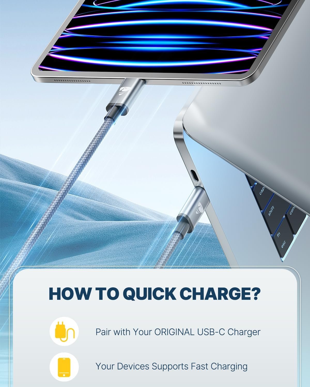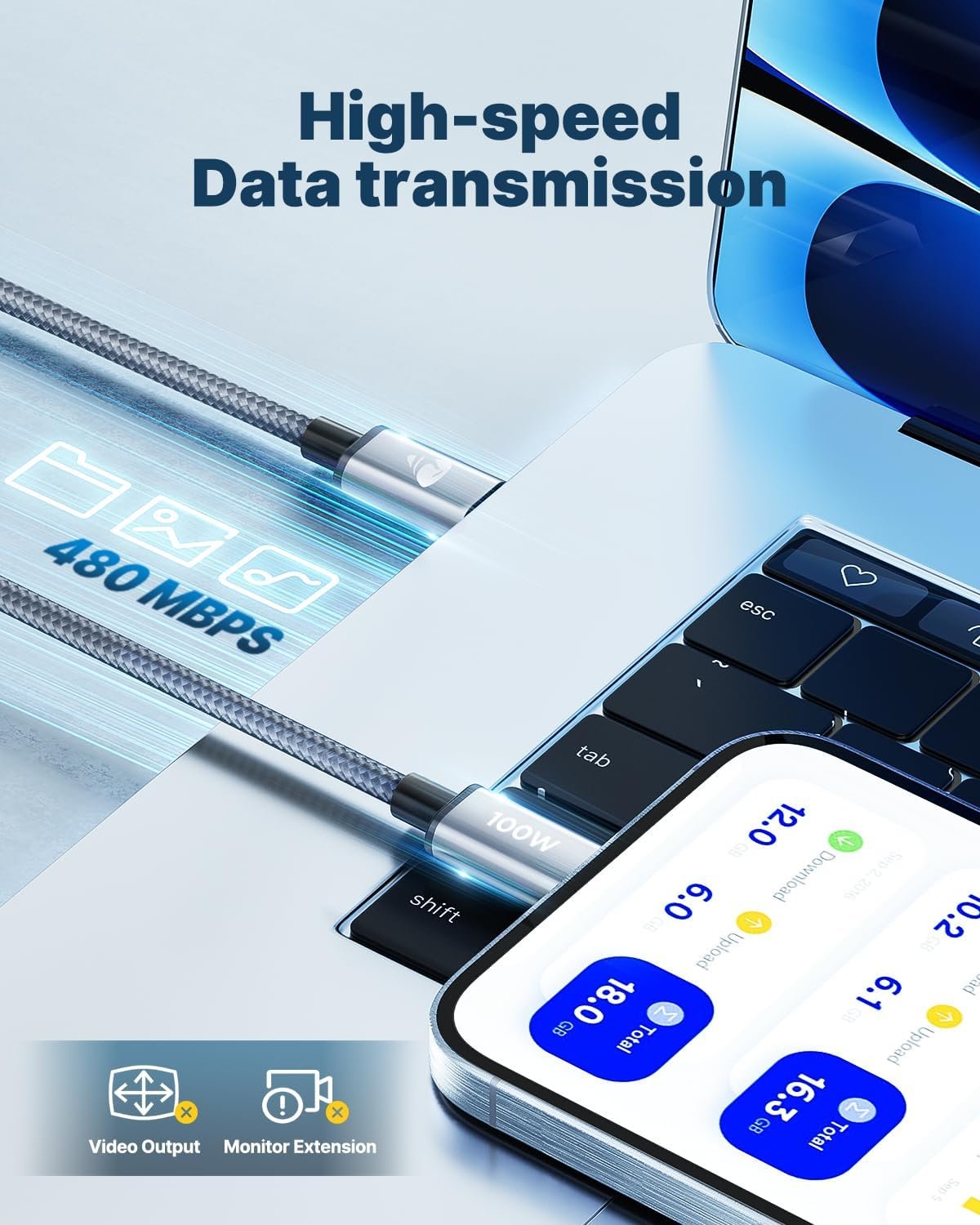 100W USB C to USB C Cable:This USB C to USB C Cable support PD3.0/QC3.0/QC4.0 fast charging up to 100W Max (20V/5A) with USB-C Power Delivery adapters such as 30W/45W/60W. USBC to USBC Cable charges a USB C cell phone from 0% to 80% in 35 minutes, iPhone 15 Pro 88% within 35 minutes, Macbook Pro 68% within 35 minutes, and data transfer speeds up to 480Mbps