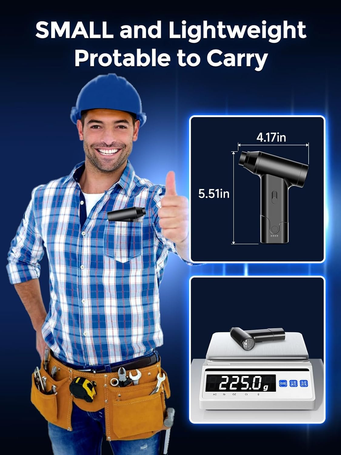 Portable Electronics Duster: Compact design, lightweight and mini, size for 4.1 inches * 1.4 inches * 5.5 inches. Jet Dry Blower ‘s weight is only 225g,the size of a palm. It can be easily placed in pockets, drawers, or inside cars, and cleaned of dust and debris anytime, anywhere.