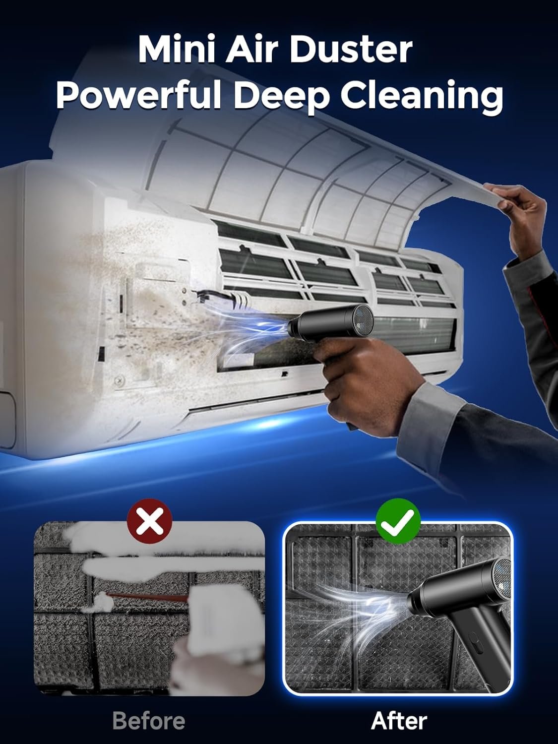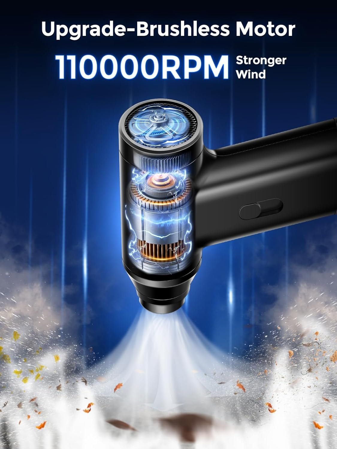 Powerful Brushless Motor: The electric duster is equipped with a brushless motor, which has a longer service life. It not only has stable performance, but also can generate a powerful 3.17 oz blowing force, with a maximum speed of 110000 RPM, effectively removing dust, and providing a nice cleaning experience.