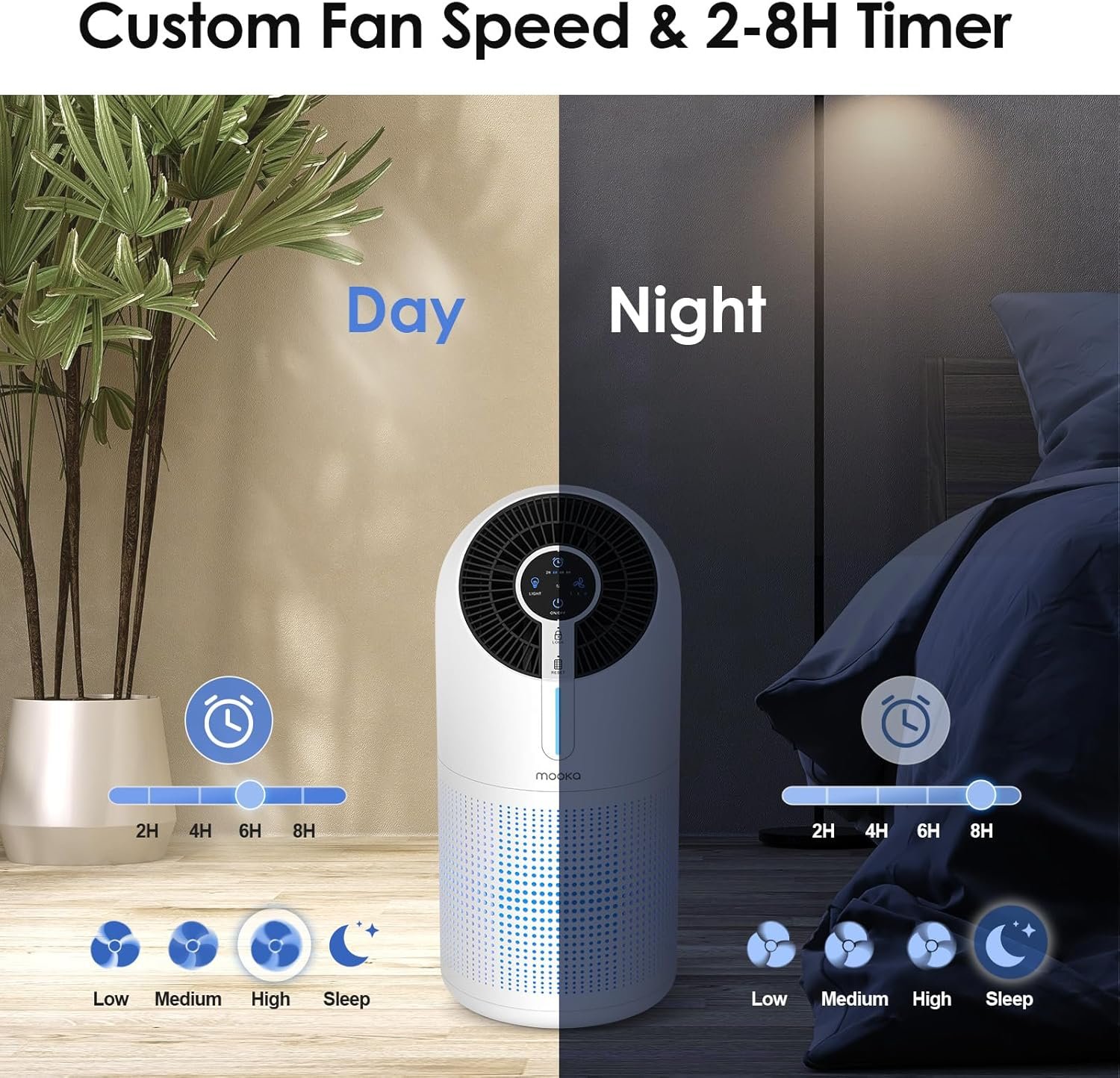 4 FAN SPEED & 4 TIMER SETTINGS & FILTER REMINDER: Adjust the required fan speed mode (Low/Medium/High/Sleep) to capture as much air pollutants as required according to the size of rooms and and air quality. 4 timer options (2H/4H/6H/8H) allow you set the operating time. When the air filter has been used for over 2160 hours, this RESET light will flash indicating you need to replace a new filter.
