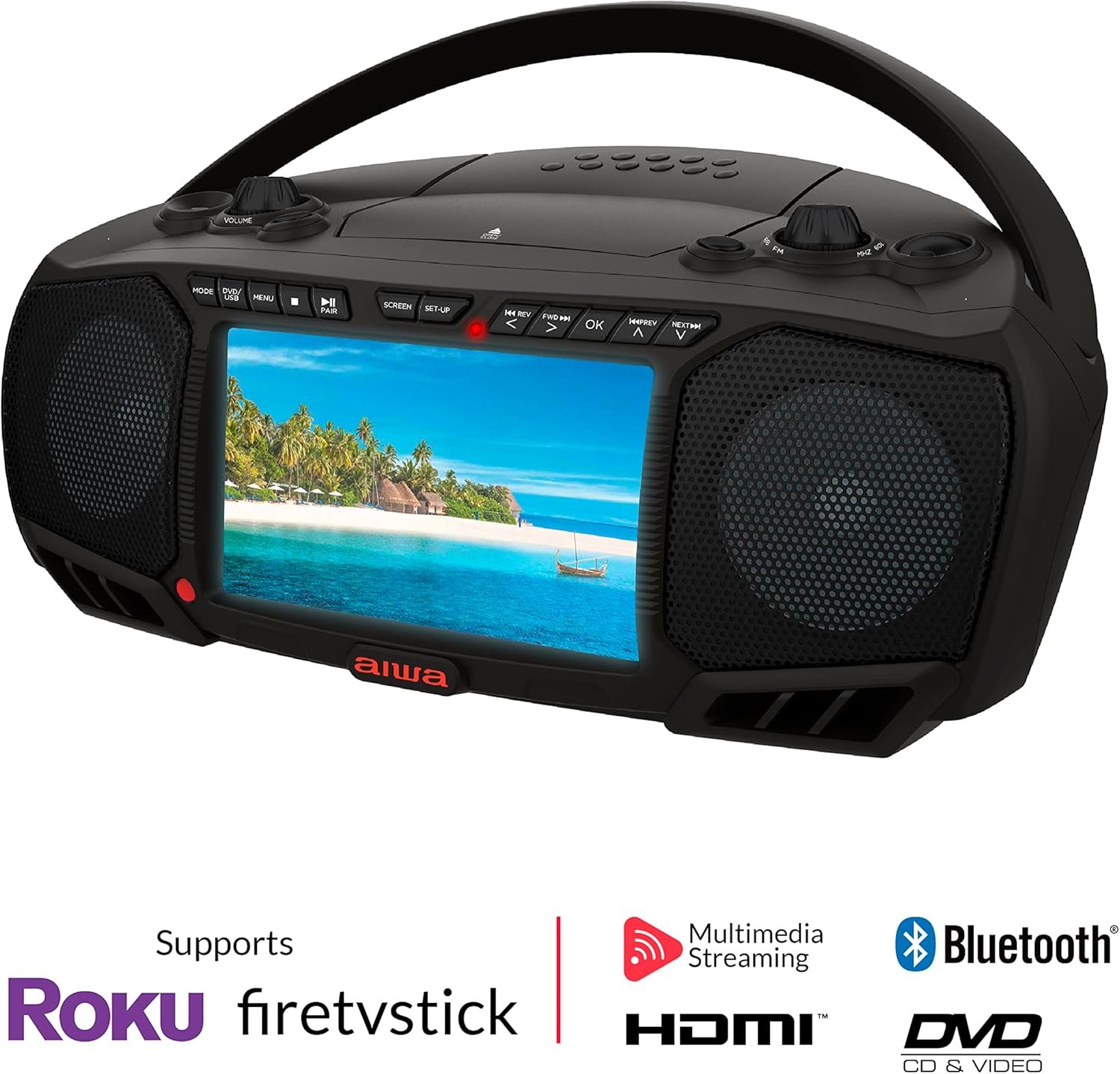 MULTIPLE PLAYBACK OPTIONS: The boombox offers a variety of playback options, including a top-loading DVD/CD/MP3 player, Bluetooth wireless, USB playback, Aux-in jack, HDMI input, audio/video output, and FM radio.