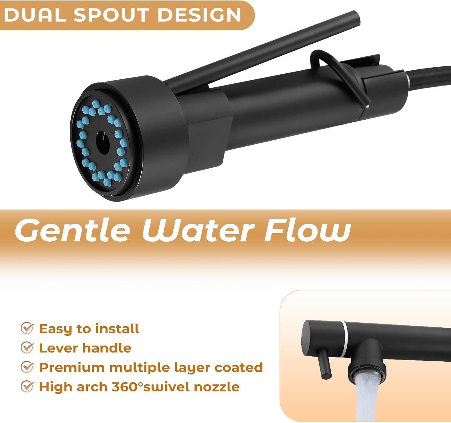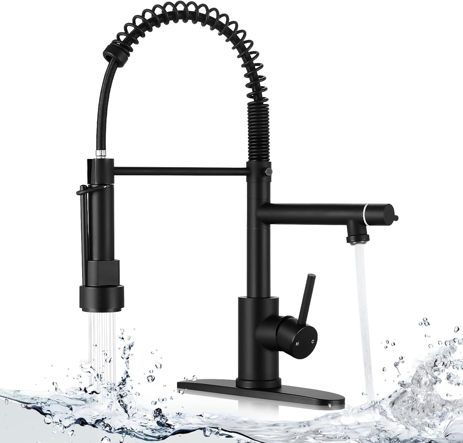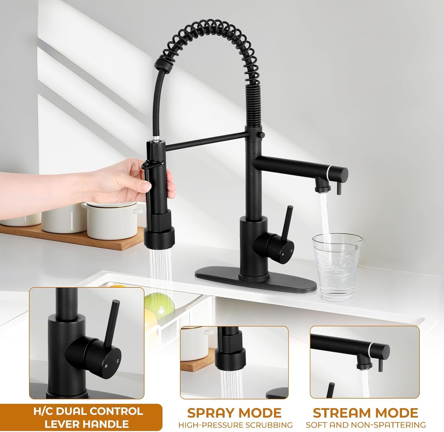 AKL Commercial Dual Spout Kitchen Faucet, Single Handle Spring Kitchen Faucets with Pull Down Sprayer, Stainless Steel Kitchen Sink Faucet with Deck Plate, Matte Black