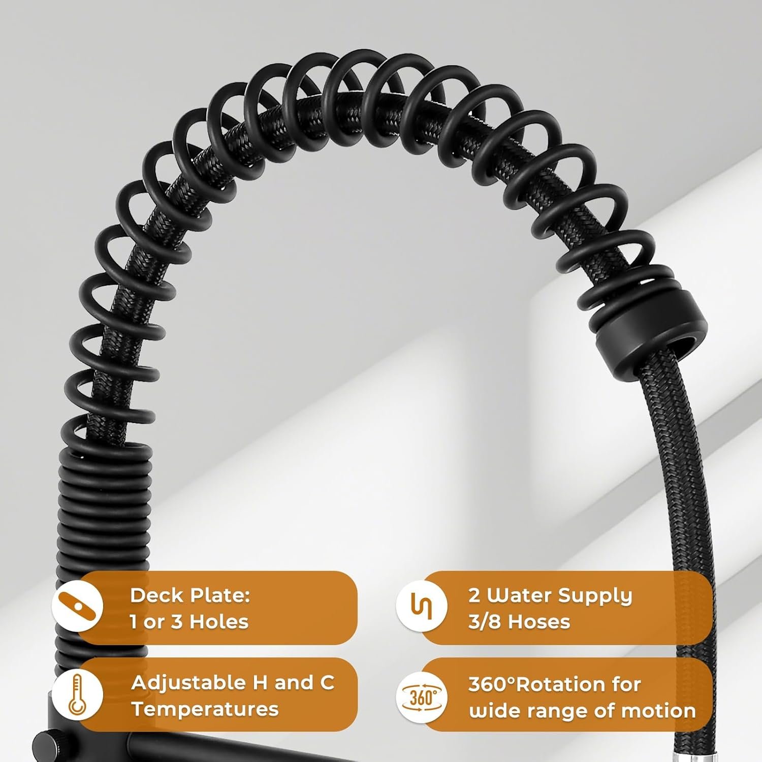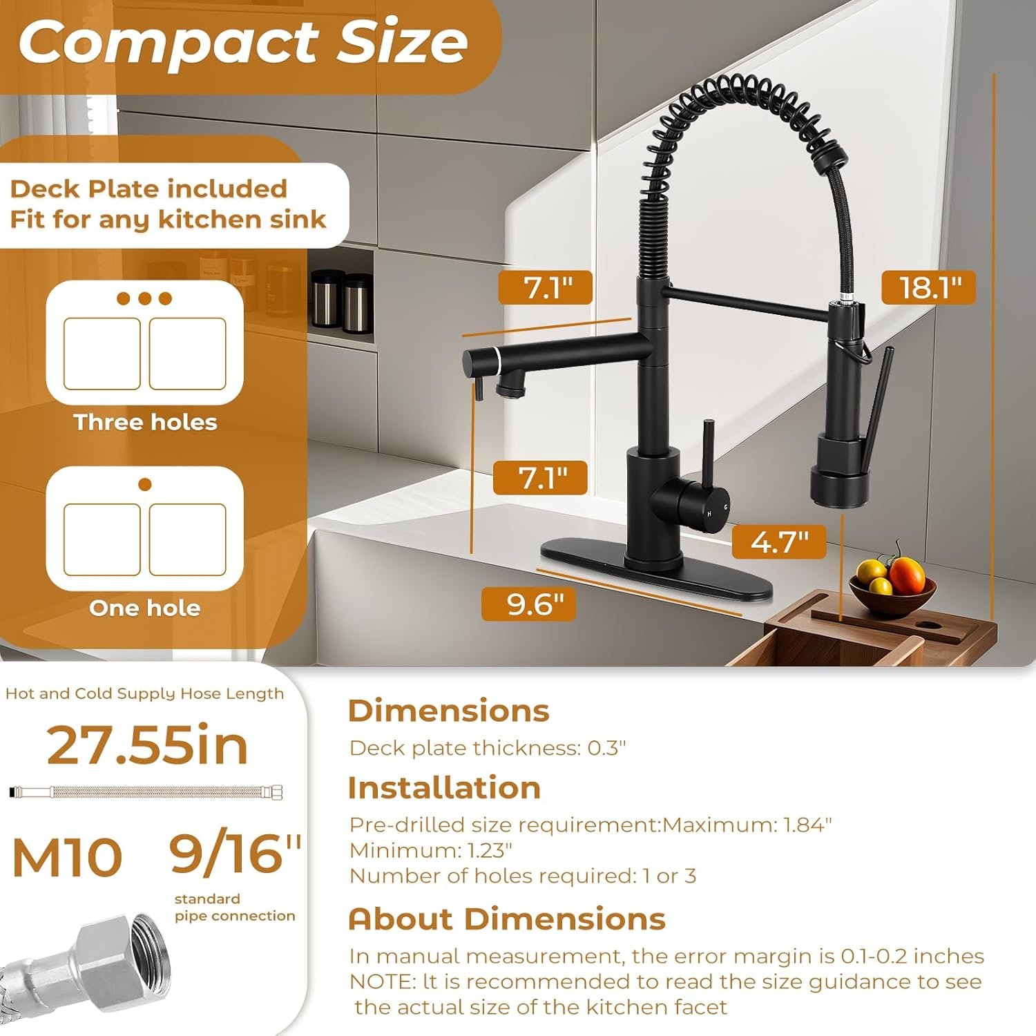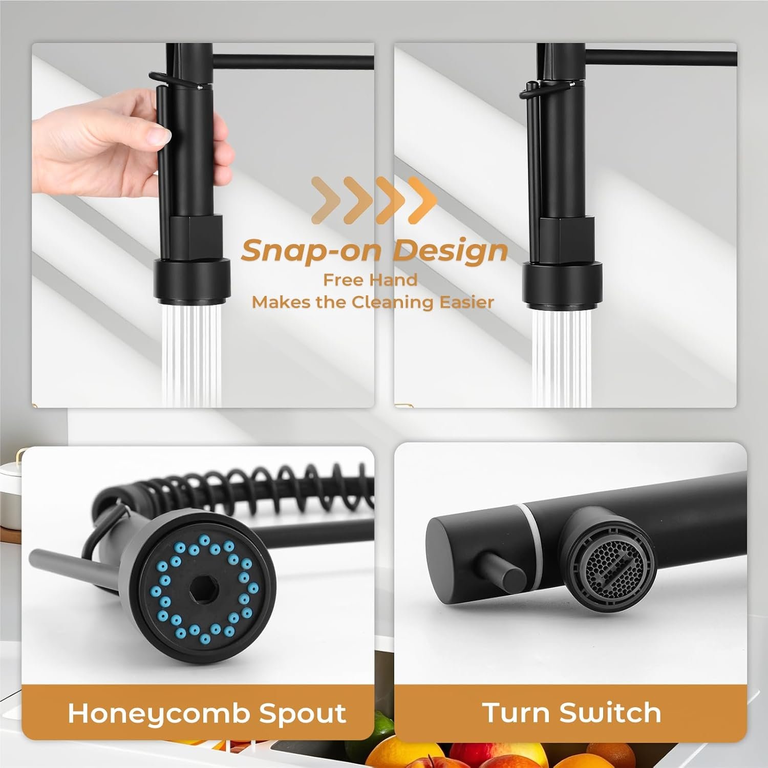 EASY TO USE: The spring-loaded kitchen faucet has its excellent flexibility and maneuverability, offering two different spray or water flow methods, a 360-degree swivel spray head and a telescopic spray head tube capable of covering a larger work area for your convenience in a variety of cooking and cleaning operations