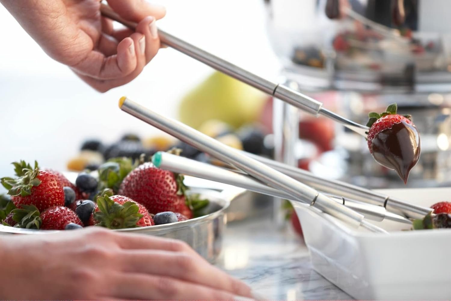 Few things are more fun to do than making fondue in a new pot. With a thick aluminum and stainless steel base and tall, curved sides, this Fondue Pot heats up fast, helping melt cheese or chocolate quickly, retains heat well, and is extraordinarily durable. The accompanying nonstick insert keeps the dip from sticking to the pot and makes cleanup easier. The lid is especially designed with a sizable opening for easy access to the tasty contents and 6 grooves to set the accompanying fondue forks in between rounds. These versatile forks can be used for everything from crackers to marshmallows and since they’re color-coded it’s easy for guests to keep track of which fork to use. For an added touch of style, it has a sleek polished finish that adds a bit of texture and refinement to your kitchen.