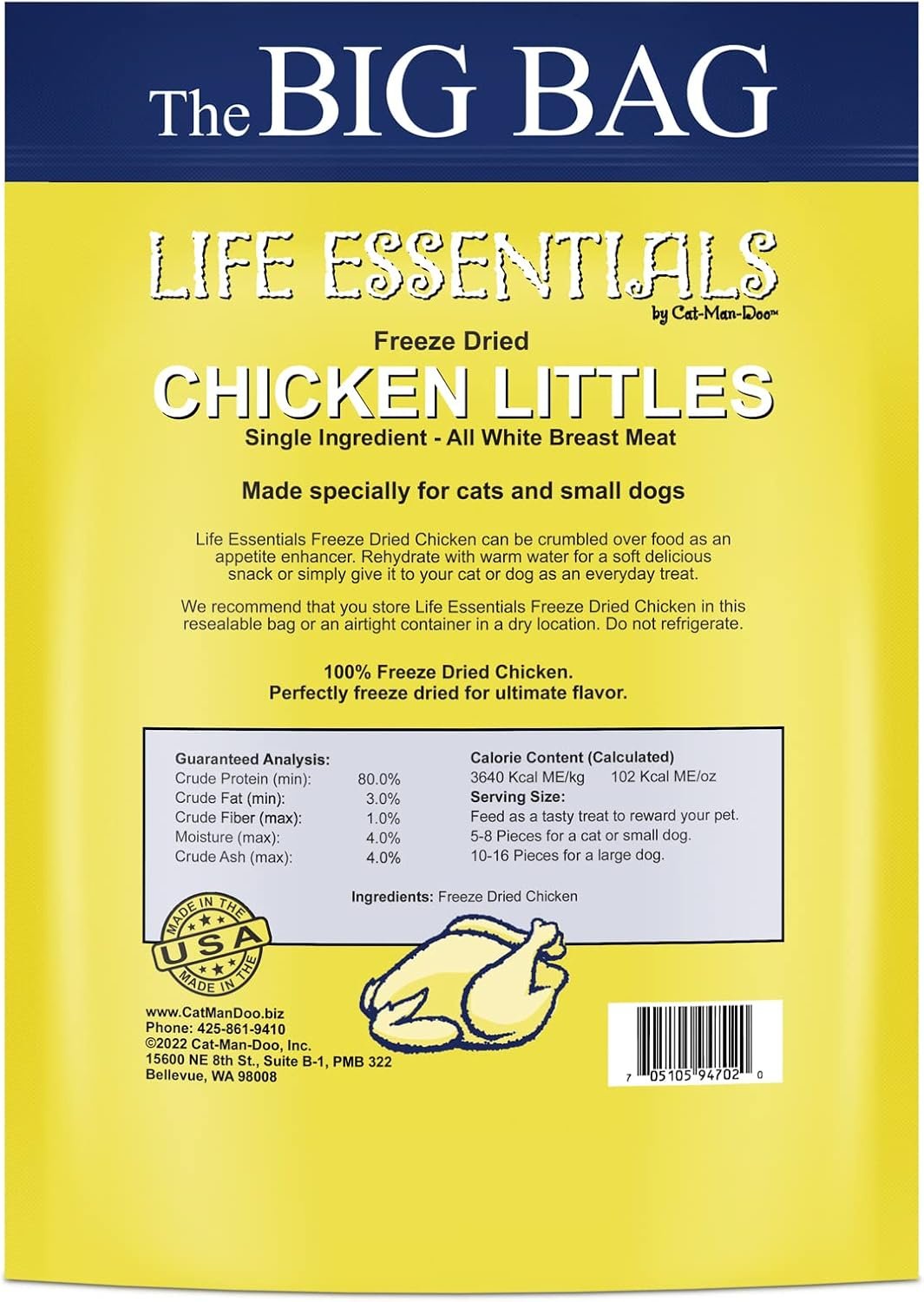 All Life Essentials products are part of the trustworthy Cat-Man-Doo brand. This human grade, FDA inspected, all white breast meat is carefully sliced into strips. The strips are then fully cooked to eliminate and then perfectly freeze dried without the use of chemicals, additives or preservatives. This is a single ingredient treat free of grains and fillers. It is low in fat, calories and carbohydrates so it won’t contribute to weight gain like biscuits and other high calorie treats. There are approximately 70 calories in ONE OUNCE of chicken. These scrumptious bites are a healthy daily snack. They make a fantastic training treat for dogs and even the most finicky cats will love them. You can feel great each time you reward your treasured four-legged family member with Life Essentials Freeze Dried Chicken. Proudly packaged in the USA. THE PET TREATS PRODUCED BY TRUE PET LOVERS!