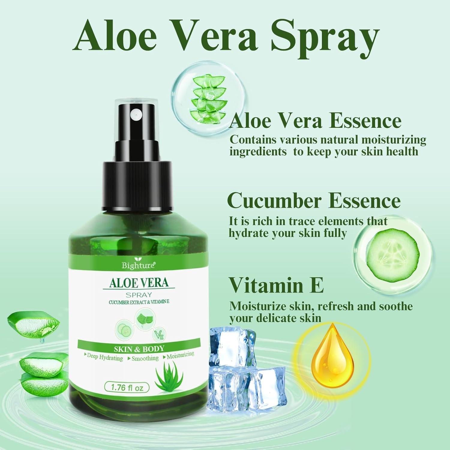 Moisturizing Skin Spray: Aloe vera spray with essence of aloe vera, cucumber and vitamin E, which can keep the skin properly moisturized helps maintain skin elasticity and prevents dryness, scaling, and wrinkles. Importantly, BIGHTURE aloe vera spray can be as toner, to help your skin lock in moisture and improve dryness in winter