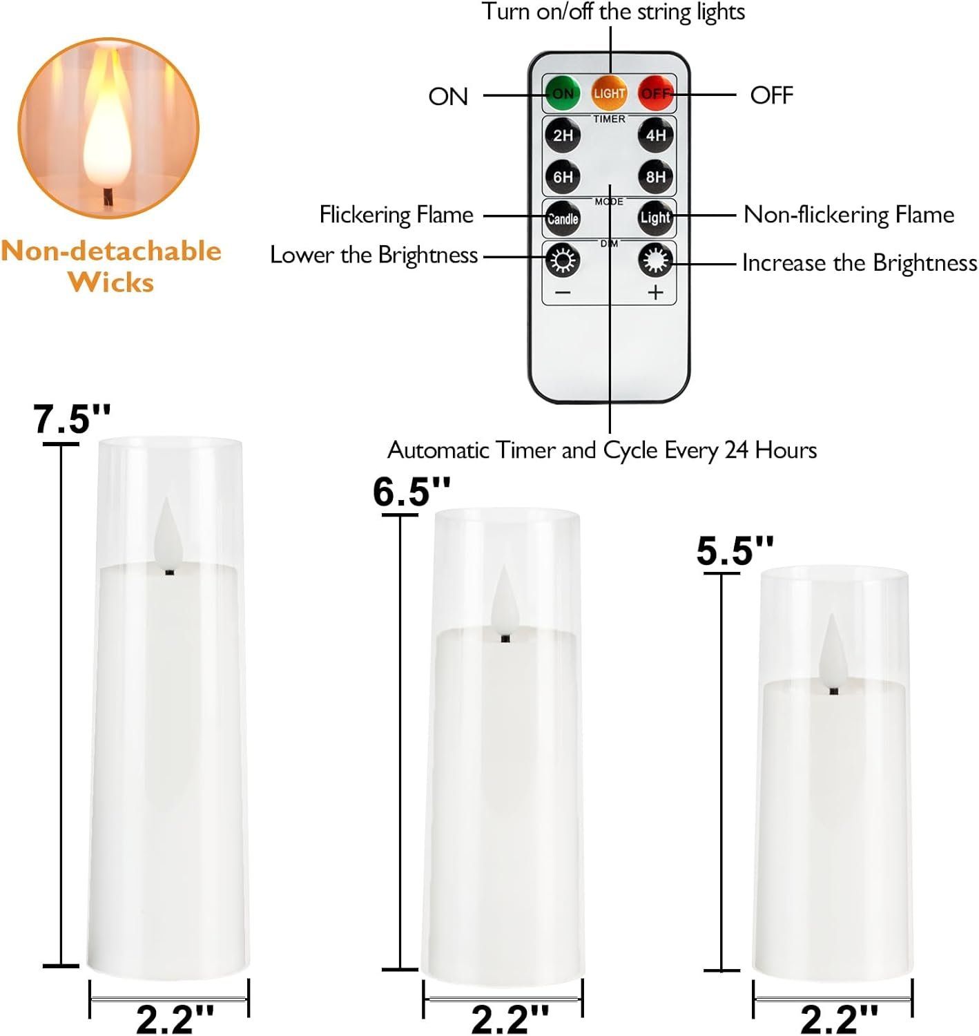 Realistic Candlelight (3D wick, Yellow and Blue Lights)Remote Control and Timers FunctionValue Pack of 9: D2.2”x H5”5″5″6″6″6”7”7″7″ (batteries not included)
