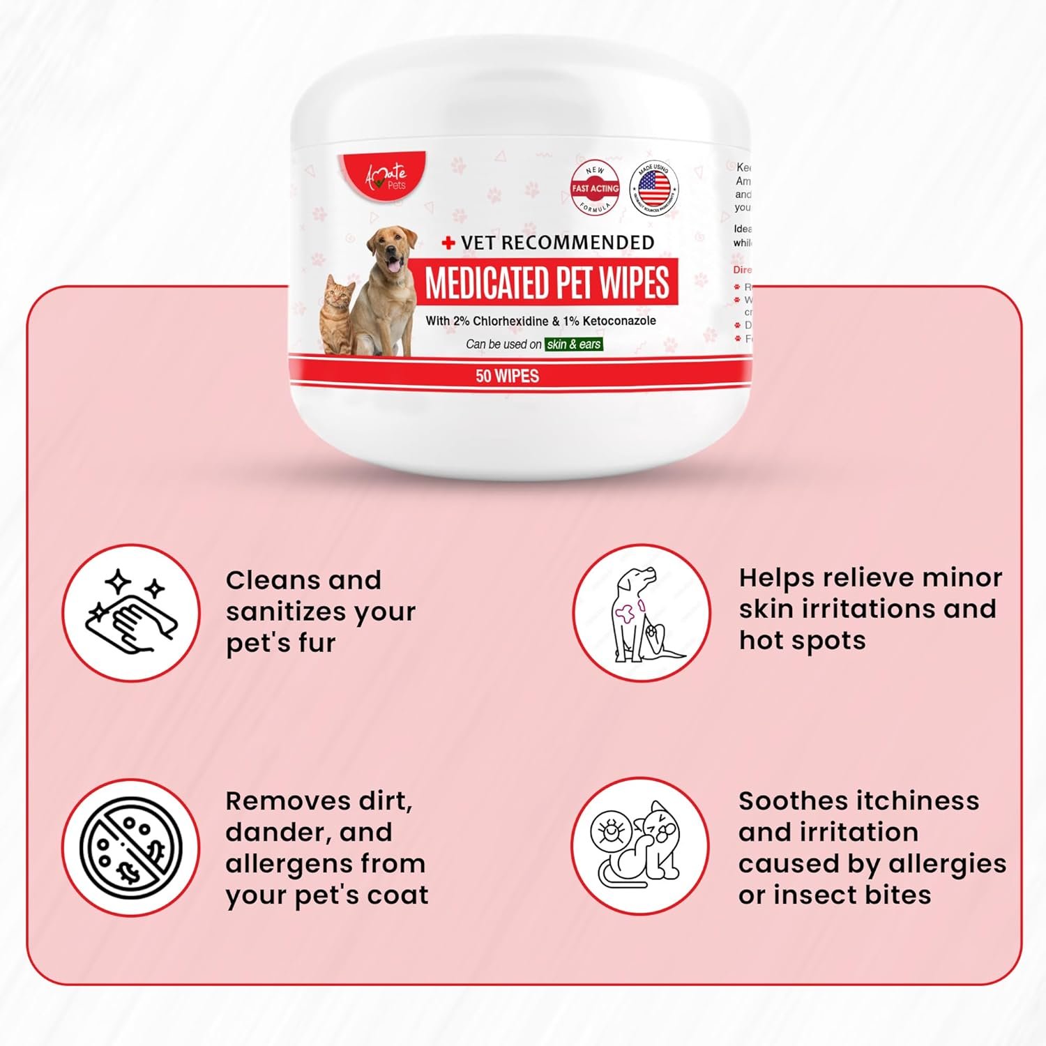 Amate Medicated Dog Wipes for Ear Skin & Coat – Pet Wipes for Dogs & Cats – 2.5” Small Wipes – Relieve Skin Issues, Hot Spots & Irritation – Pack of 50