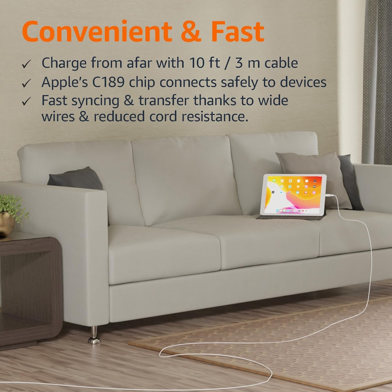 FAST CHARGING: Wide-diameter wires and reduced cord resistance maximize charging speed; supports up to 2.4 amps charging current