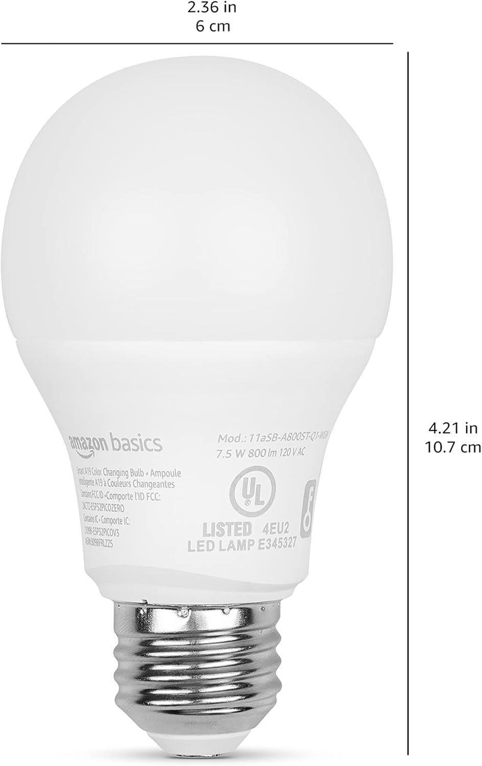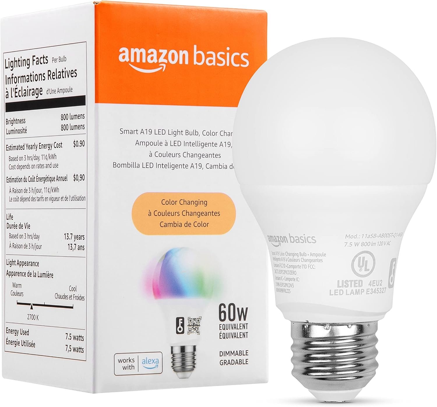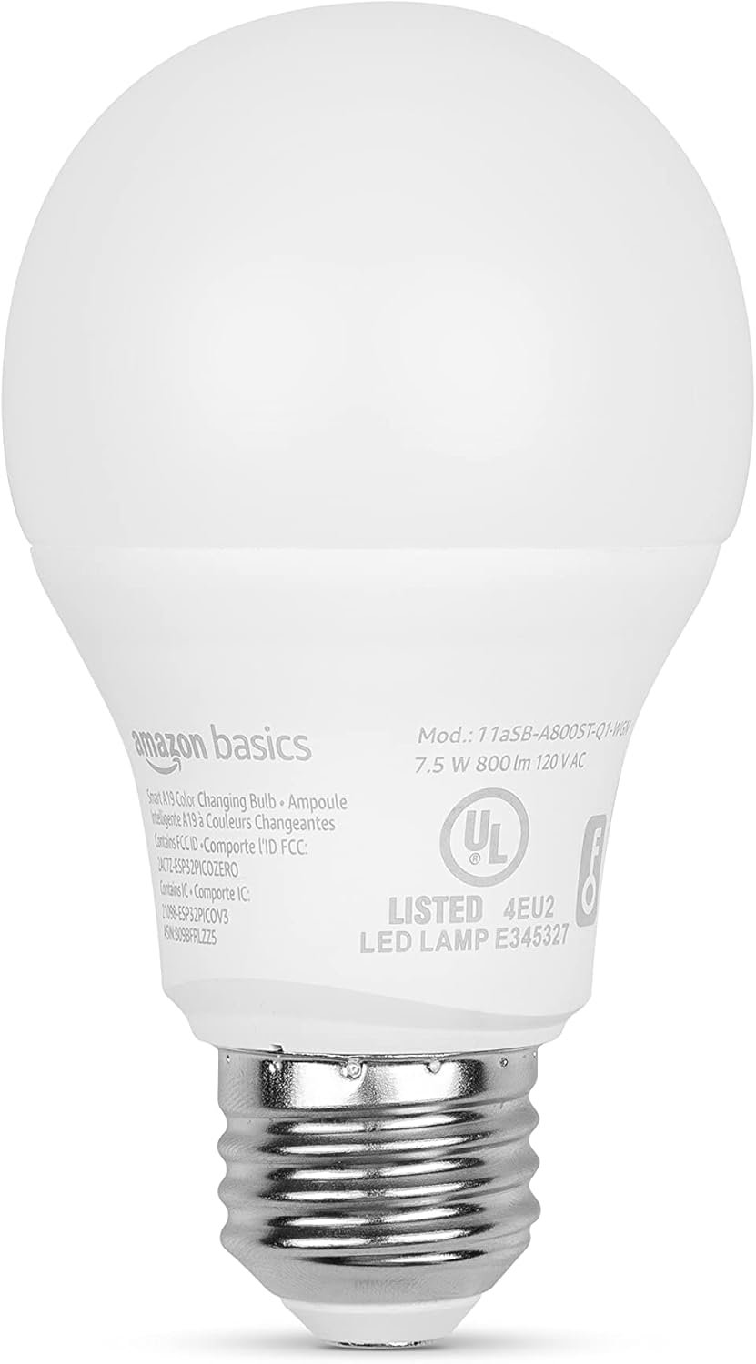 Amazon Basics Smart A19 LED Light Bulb, Color Changing, 60W Equivalent, 800LM, Works with Alexa Only, 2.4 GHz Wi-Fi, No Hub Required, 1-Pack