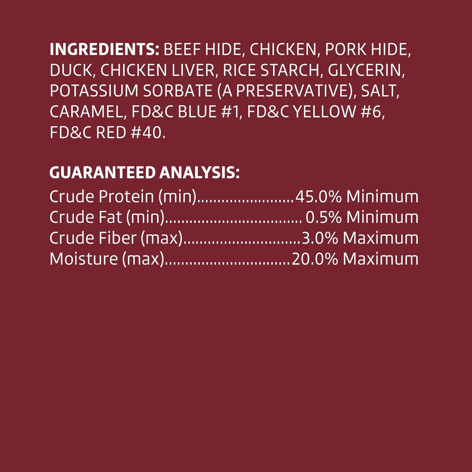 MADE WITH REAL MEAT: Made with beef hide and pork hide wrapped in a flavor trio of real chicken, duck and chicken liver