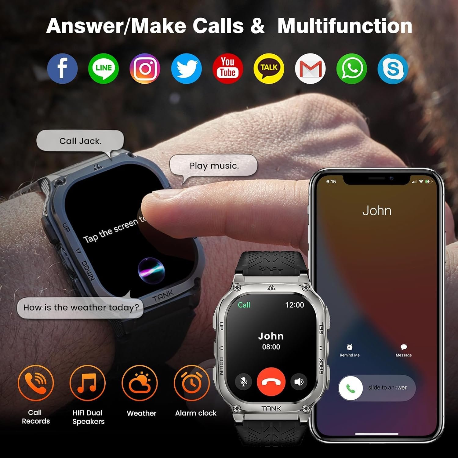 ⌚ANSWER/MAKE CALLS & AI VOICE ASSISTAN – A very handy tool built in the Bluetooth watch. Use your voice to give instructions and the voice assistant will do the rest. You can ask questions, play your desired music, and check weather, set alarms and timers. You can also make voice calls through the voice assistant, makes the scenes that are inconvenient to hold a mobile phone (For example: driving) in daily exercise and life more concise and smart.