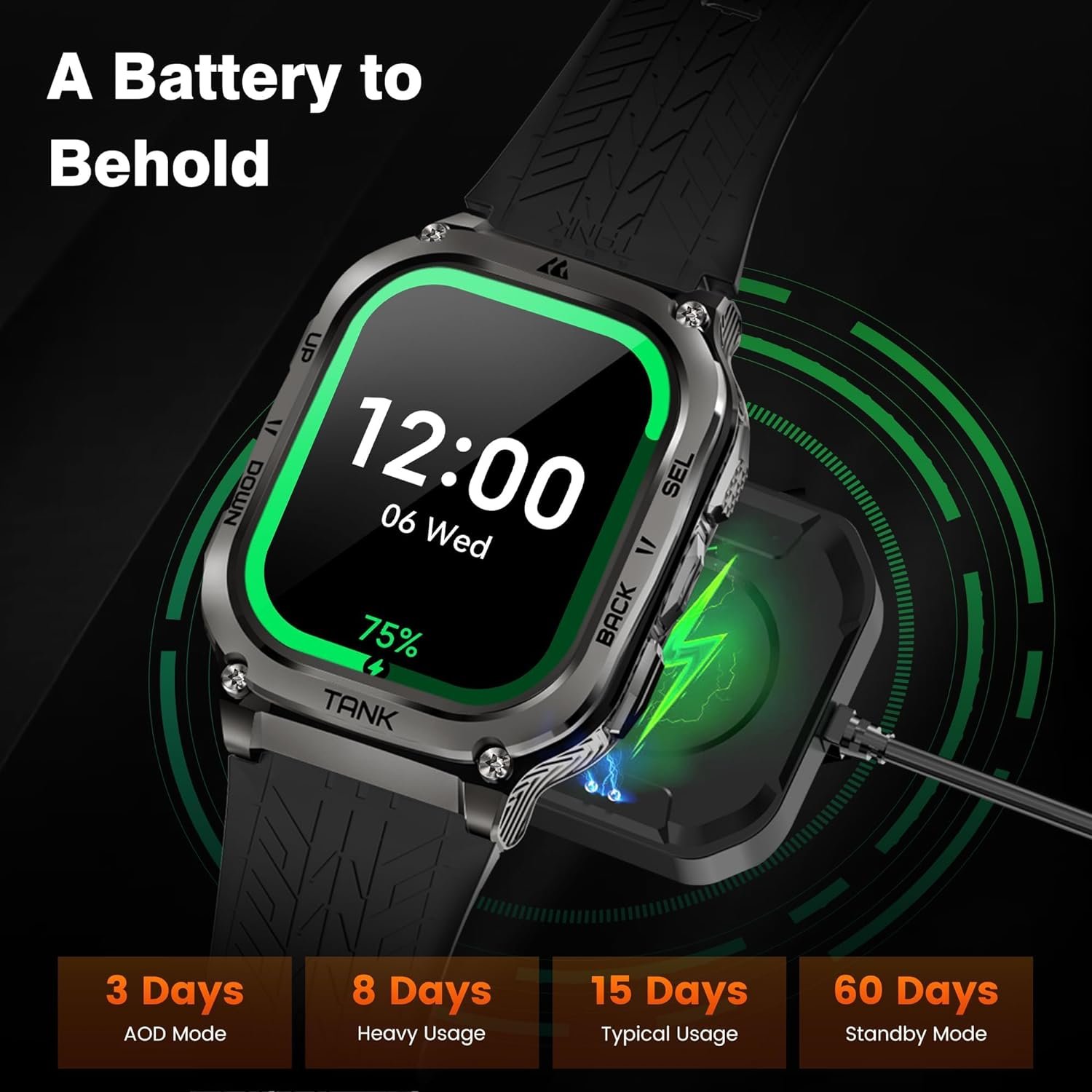 ⌚60 DAY+ ULTRA-LONG LIFE BATTERY – M3 is equipped with 100% pure cobalt-based battery (military grade), with a battery capacity of up to 480mAh, twice that of traditional smartwatches. At the same time, it adopts an industry-breaking super power-saving AI algorithm to minimize power consumption. Under normal use, the battery life is up to 2 weeks. In power saving mode, the sports mode, health index measurement and other functions can be used continuously for up to 60+ days.