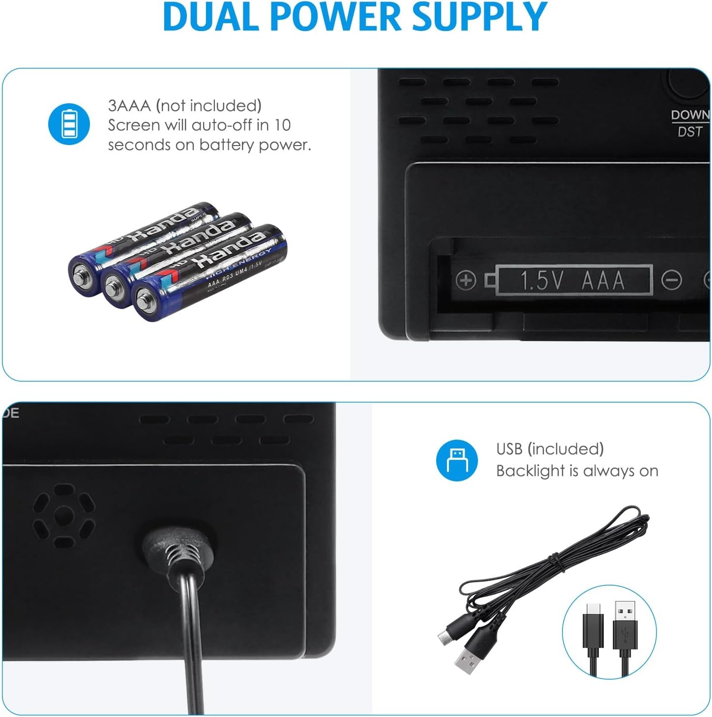 Two Types of Power Supply: For this alarm clocks for bedrooms, coming with 1.5meter/59inch power cord (AC adapter is not included)- very good for battery saving, and it comes with time memory function when you charge by AAA batteries. (When powered by type-c cable alone, there is no time for memory function after power off).We recommend that you install the battery and use the Type-C for continuous power supply, the alarm clock will continue to standby with the screen on and have the time memory function after power off. This way you can check the time at any time and save power!