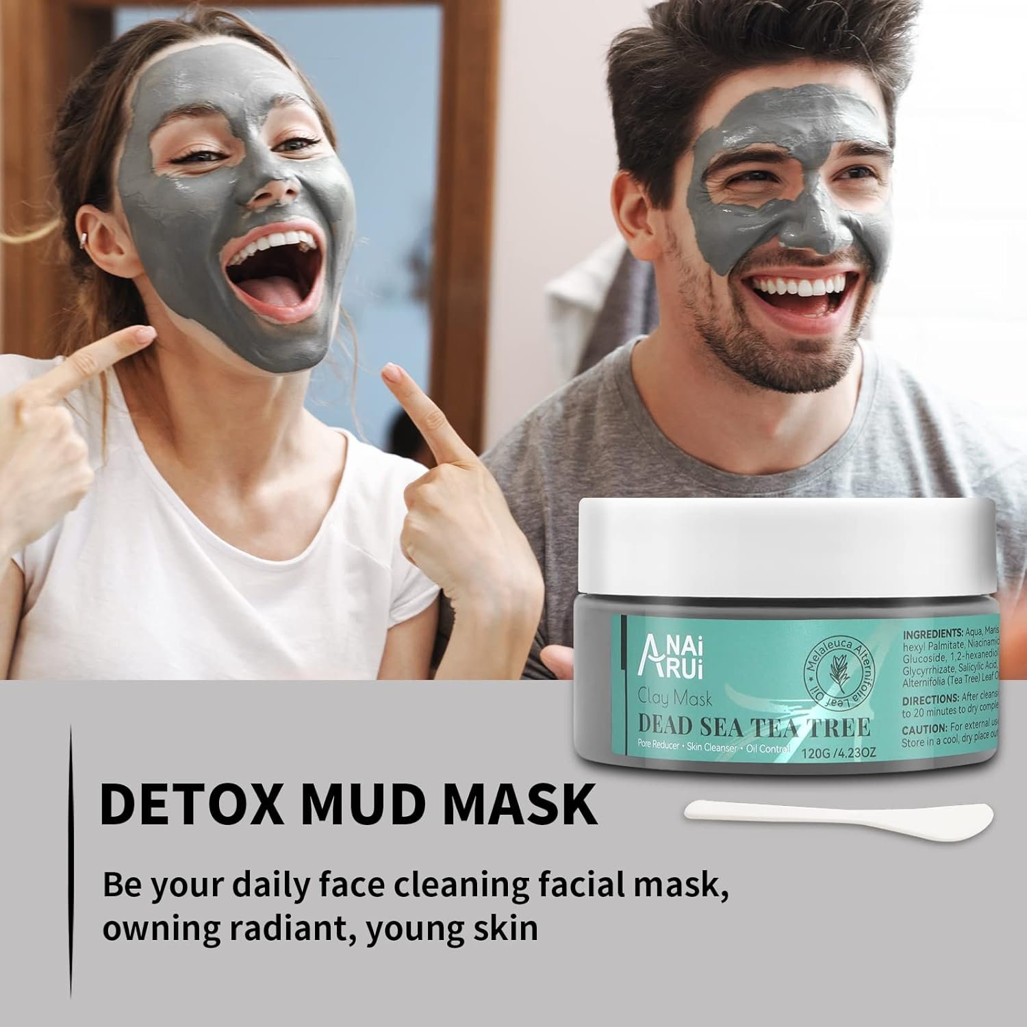 DEEP PORE & EXCESS OIL CLEANSER — ANAIRUI Tea Tree oil-infused dead sea mud mask, contains minerals-rich dead sea mud and activated charcoal, sea salt, helps skin exfoliates, to deeply cleanse pore dirties and lift away dead skin cell, fights whiteheads & blackheads, clogged pores, acne scars and excessive oil.
