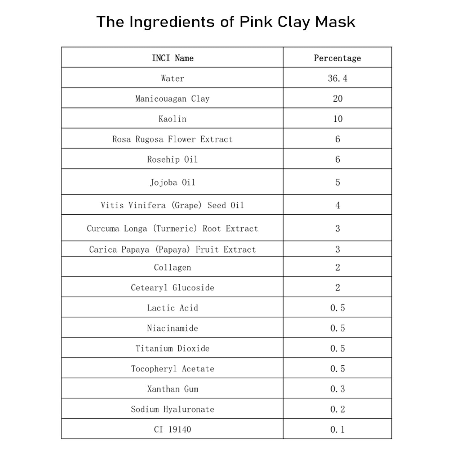 Ingredients List of Rose Clay Mask — Manicouagan Clay, Kaolin, Rose Rugosa Flower Extract, Rosehip Oil, Jojoba Oil, Vitis Vinifera(Grape) Seed Oil, Turmeric Root Extract, Carica Papaya Fruit Extract, Collagen, Niacinamide, Hyaluronic Acid