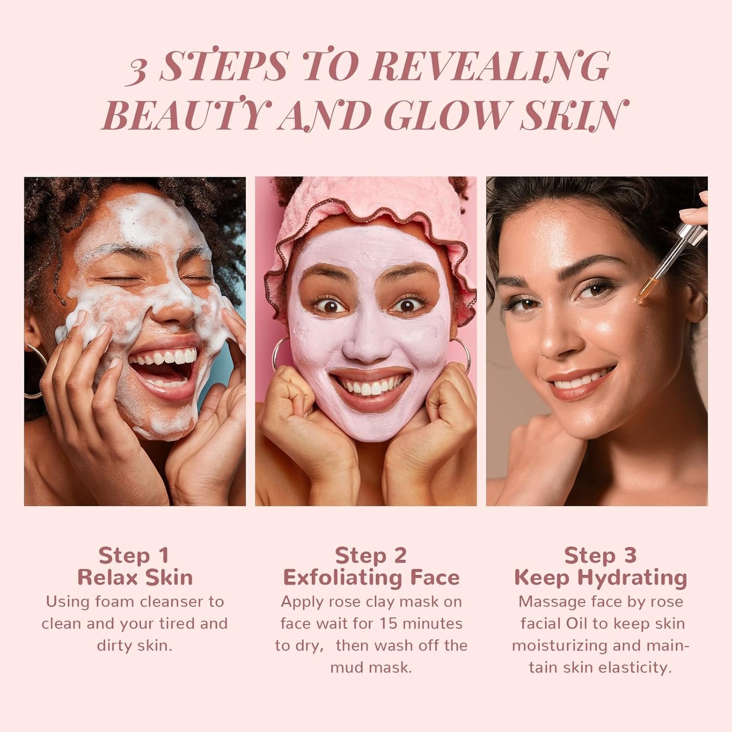 Purify & Hydrate Face Set: If you find a face washing & moisturizing set for your face, our rose facial kits are ideal. Face mousse cleanser helps to wake up and soothe sleeping skin. Pink clay mask works to purify and soften your face. Squalane oil enables to moisturize and supple your skin. A perfect skincare set for women at home, face spa, and travel.