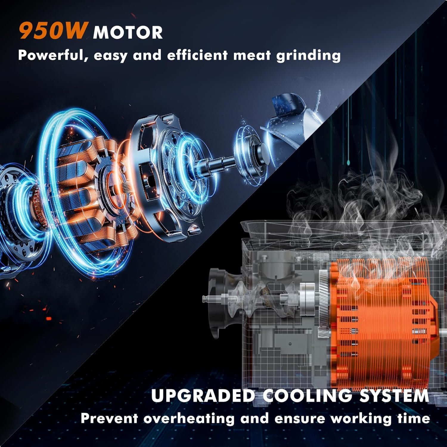Powerful Performance: This 110 V professional meat grinder with a 1.3 HP/ 950 W motor works efficiently and saves a lot of time; the advanced cooling system effectively prevents the motor from overheating, ensuring longer running time