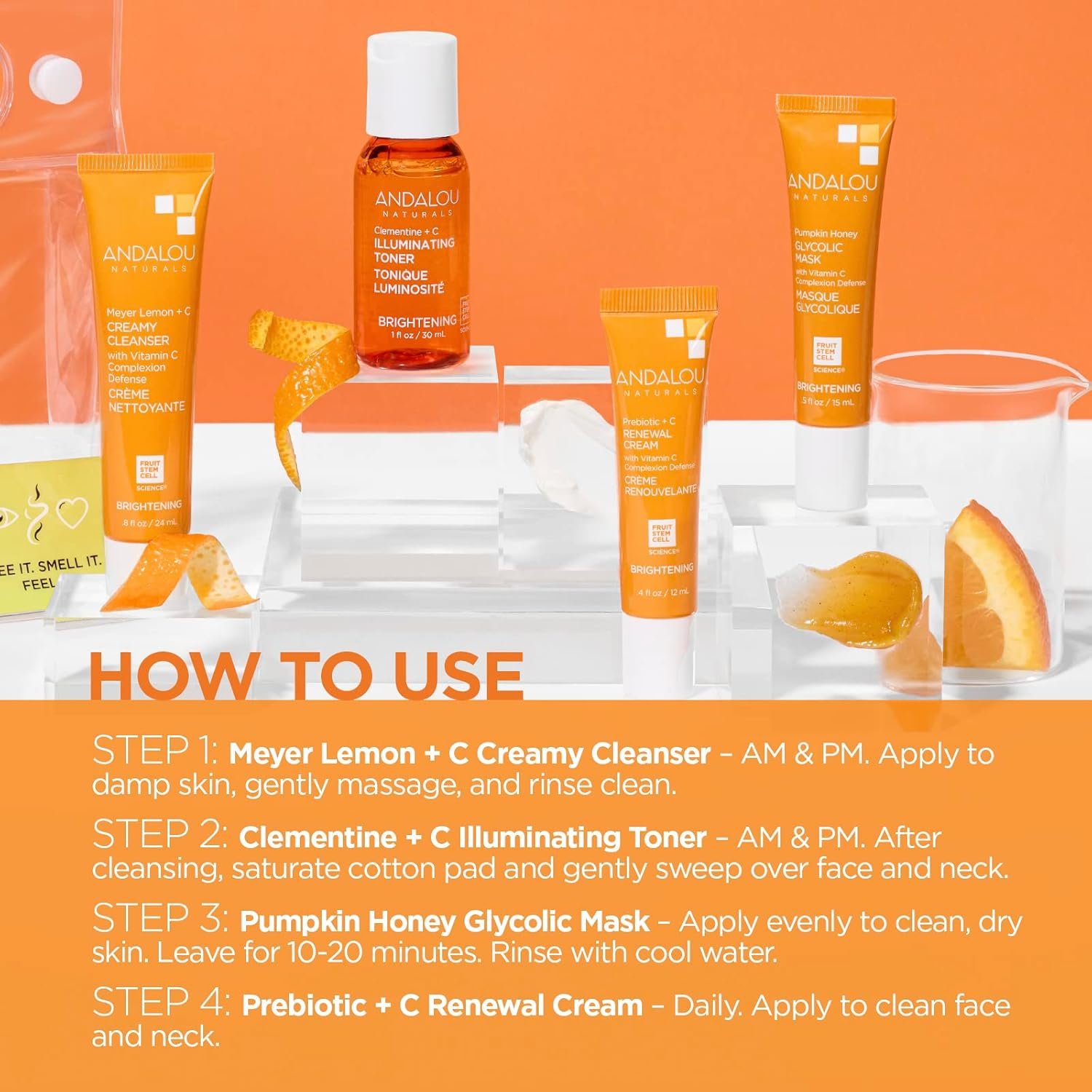 Brightening Routine: Kit includes Meyeer Lemon + C Creammy Cleanser 0.8 fl oz, Clementine + C Illuminating Toner 1 fl oz, Pumpkin Honey Glycolic Mask 0.5 fl oz, Probiotic + C Renewal Cream 0.4 fl oz, and reusable bag