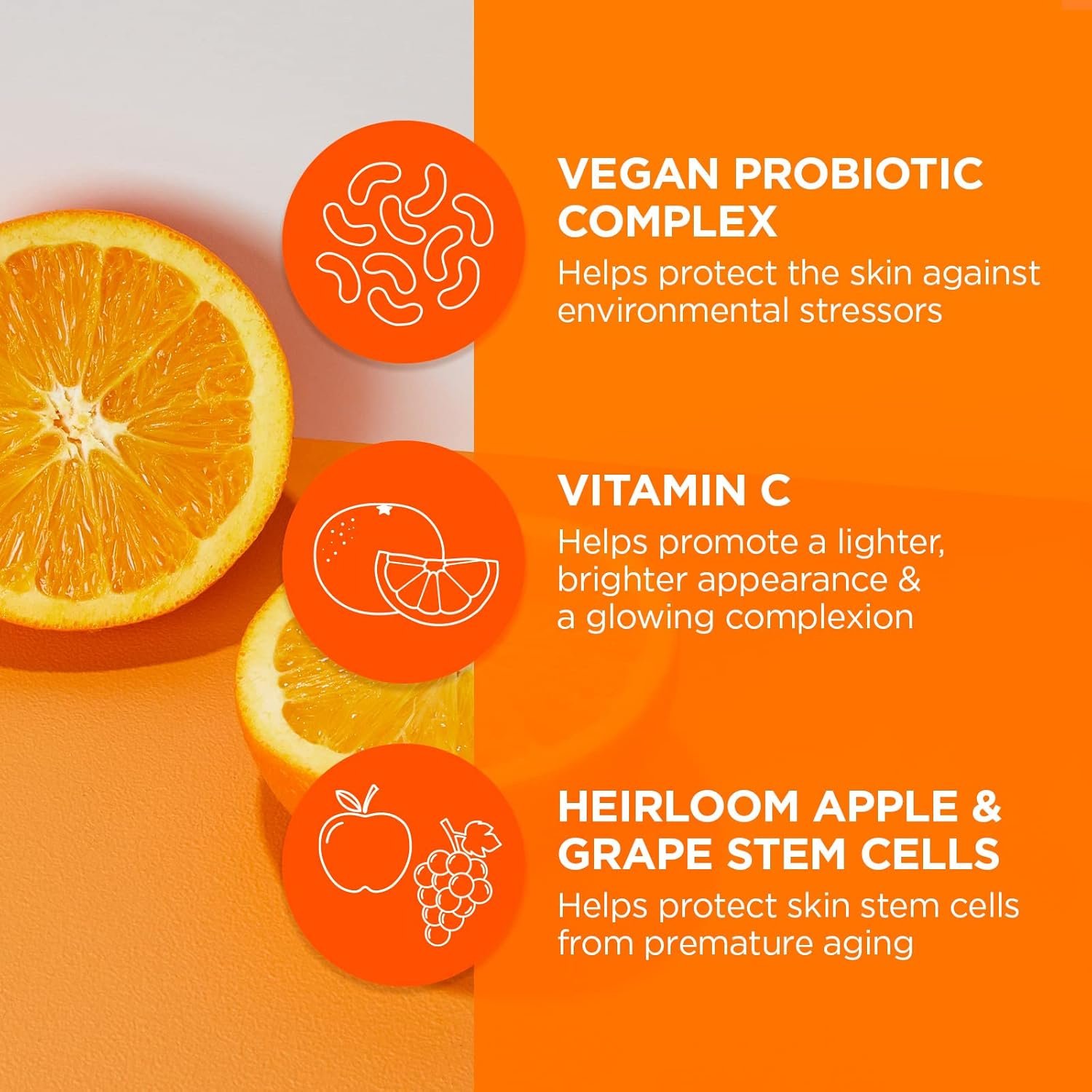 Brightening: Vitamin C and Apple Stem Cells help support skin’s vitality by targeting sun damaged, dull, dry and overexposed surface cells, while promoting a tighter, brighter appearance and a luminous complexion.