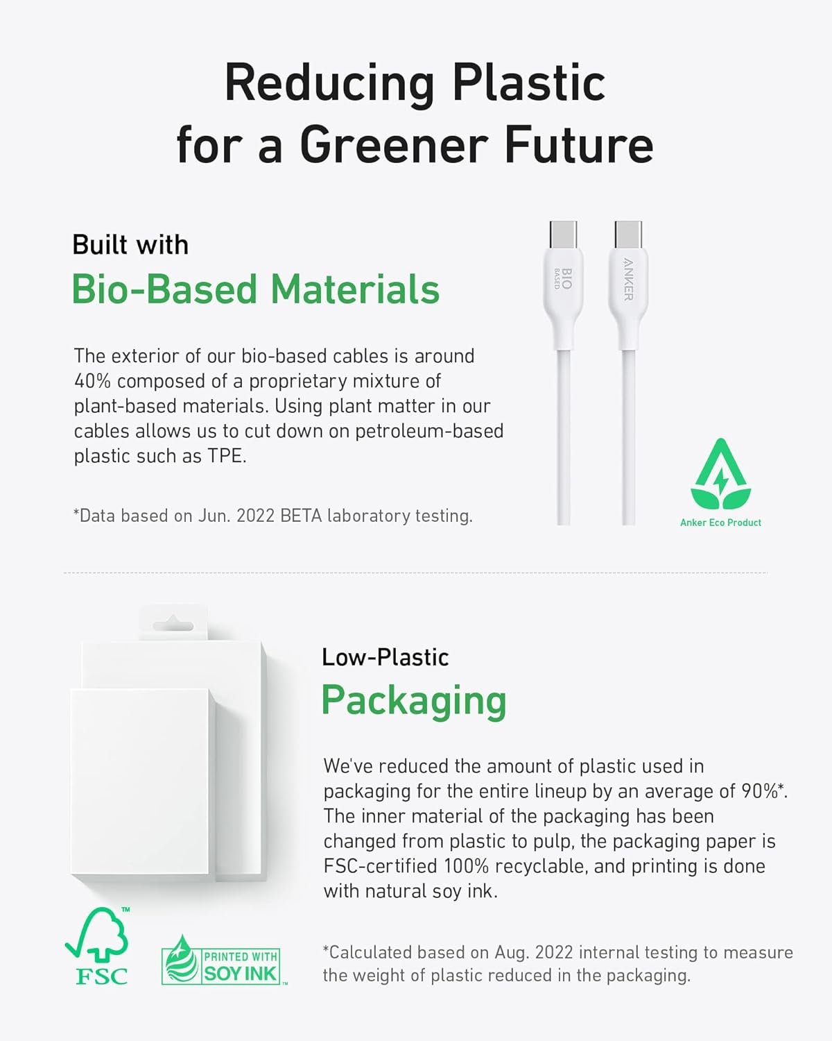 The exterior of the cable body is constructed with bio-based materials, while the packaging is made of 100% recyclable paper and printed with soy ink.