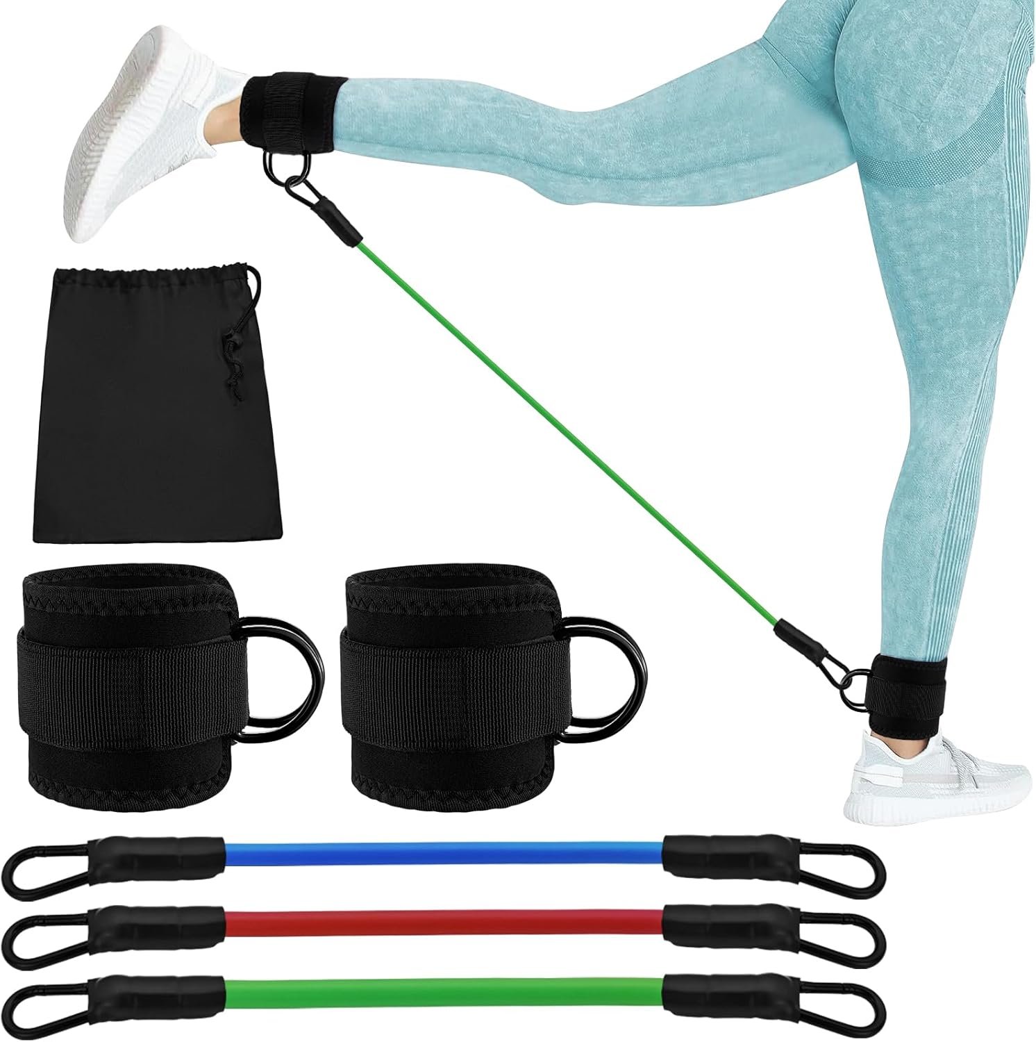 Quality Material: Leg resistance bands with ankle cuffs are made of quality sponge and latex material, flexible and strong enough to withstand strenuous exercise. Our resistance bands are not easy to break and have excellent rebound, with a pair of double D-ring adjustable ankle cuffs, which are soft and comfortable, so that you can rest assured that your legs and hips are training