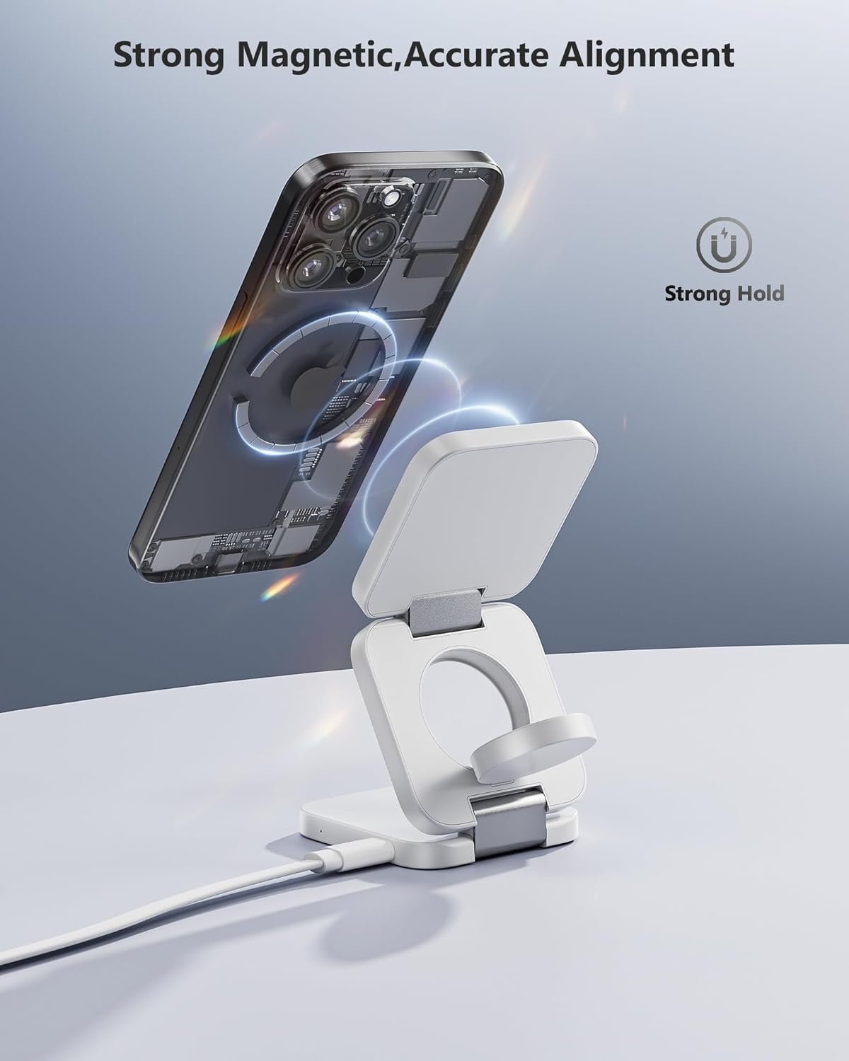 【Strong Magnetic Alignment】Built-in high quality magnets hold your iPhone firmly in the optimal charging position and automatically lock it in place. Built-in 3 coils wide charging area brings you fast and stable wireless charging experience. Magnetic function of this iphone 3 in 1 charger is only compatible with iPhone 16/15/14/13/12 series.