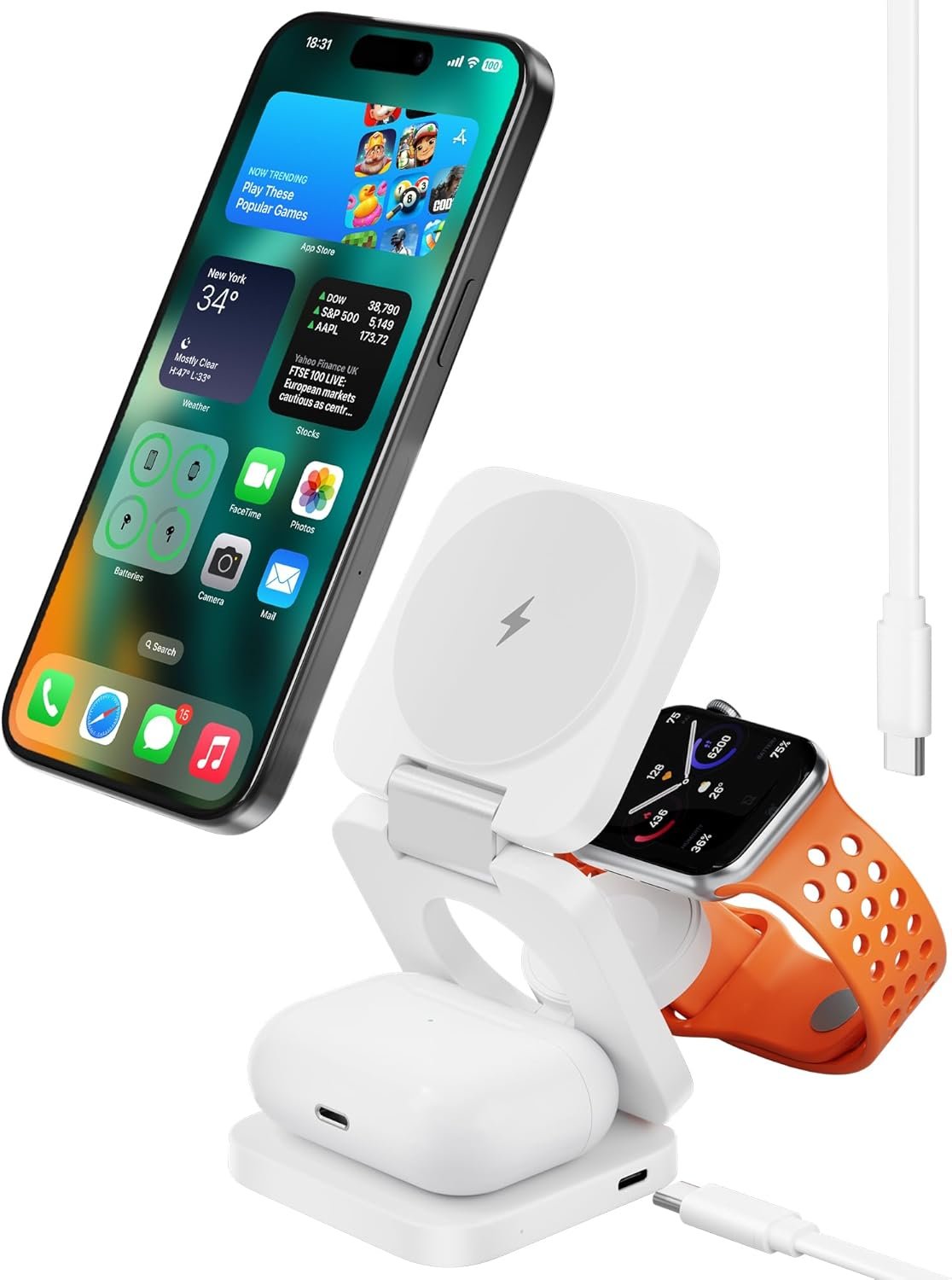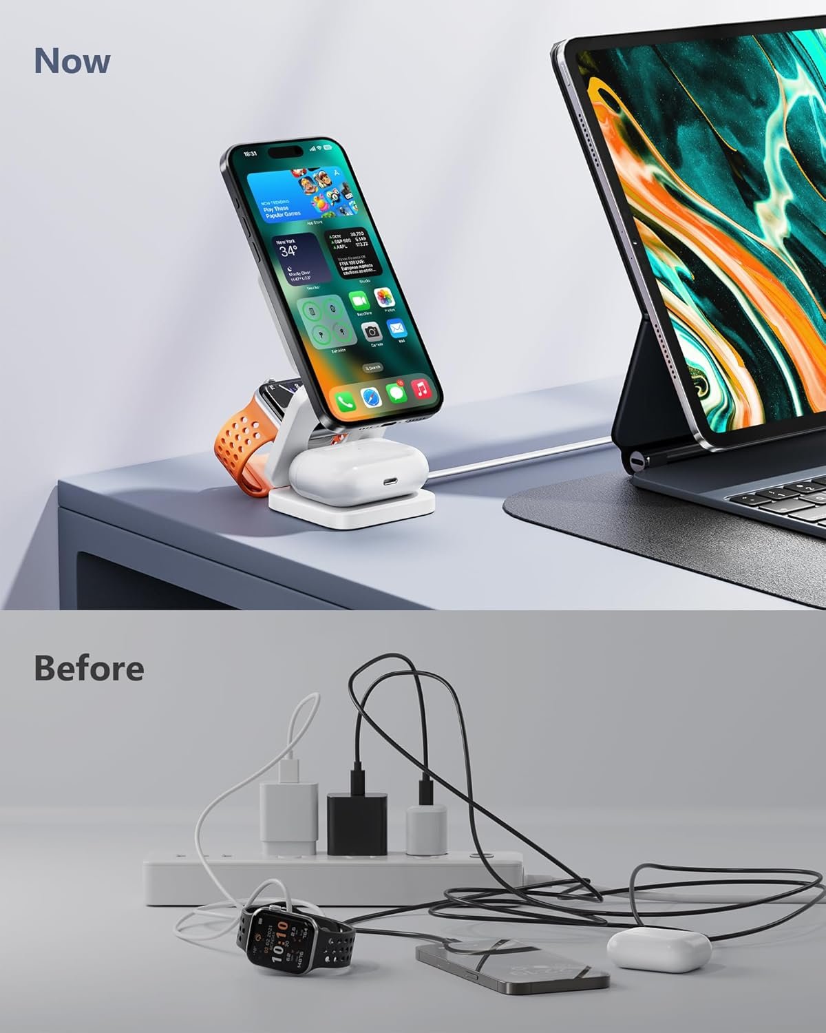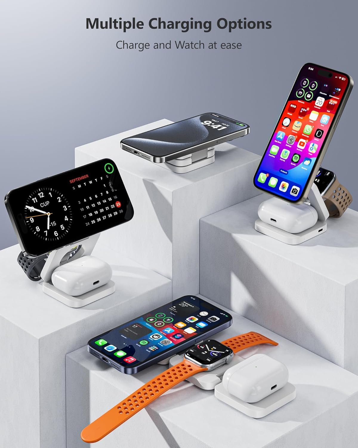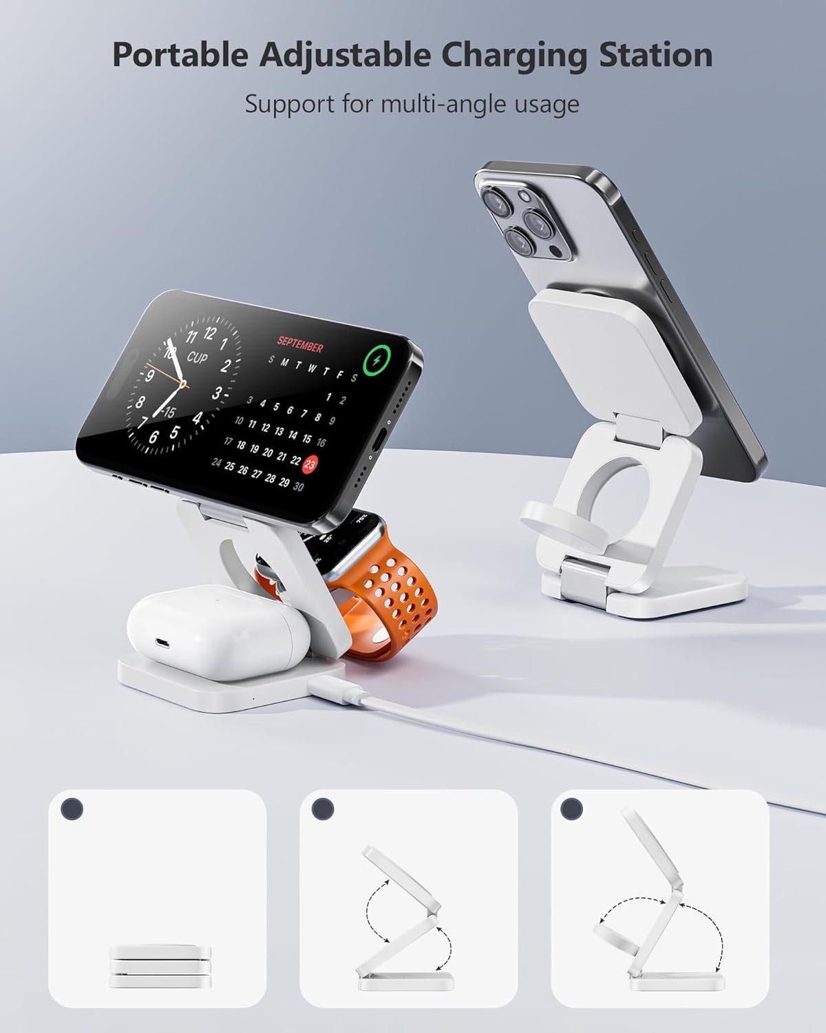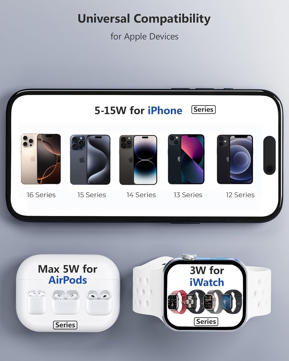 【Universal Compatibility】This 3 in 1 foldable charging station can supports fast charging for multiple Apple devices. Compatible with iPhone 16 15 14 13 12 Series, Apple Watch Ultra/Ultra 2/Series 9/8/7/6/5/4/3/2/1/SE, and AirPods Pro/3/2 with wireless charging cases (not compatible with non-wireless charging AirPods 2), Also compatible with more QI wireless charging phone devices.