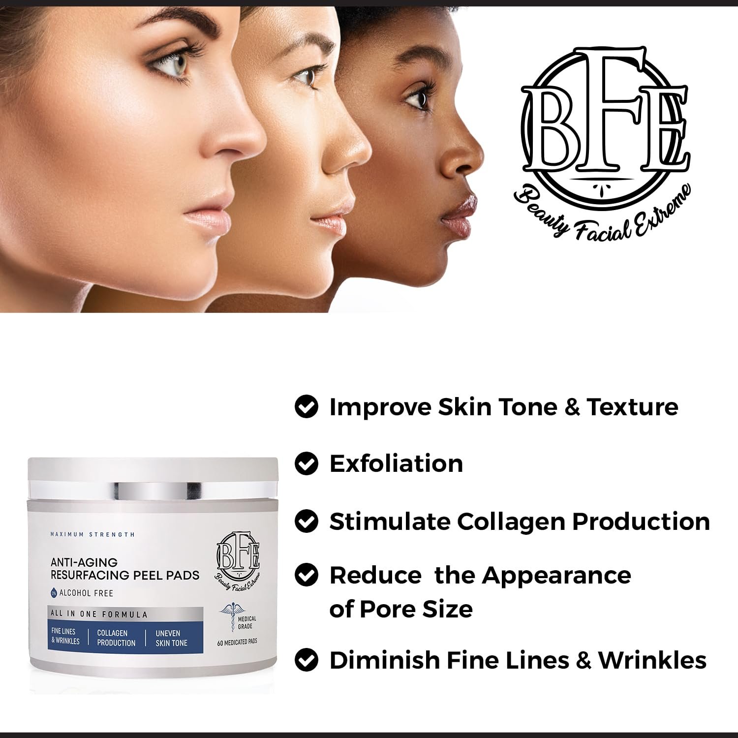 Anti Aging Resurfacing Exfoliating Peel Pads Treatment- Contains Lactic, Salicylic, & Glycolic Acid for Face & Body. Repairs Fine Lines, Wrinkles, Dark Spots, Pores, Acne Scars & Uneven Skin Tone. Natural Skincare Glow. Delivers pore refining microdermabrasion exfoliation on a smoothing textured pad. Naturally contains soothing botanical ingredients to regulate healthy cell turnover to brighten and clarify skin. Visibly reduces the appearance of imperfections, marks, and spots with a triple action peel delivery system. Powerful unwrinkle treatment. Boost results with retinol treatments every other night. Join thousands of satisfied customers who have discovered the exceptional value and quality of Beauty Facial Extreme’s skin care products. We invite you to visit our Amazon storefront and discover the beauty that awaits you. Beauty Facial Extreme’s products work, and they work extremely well. We stand behind our products 100%, with a guarantee of significantly transforming your skin to achieve healthy and more vibrant skin. Order Now, 30 Day Money Back Guarantee. Highly effective chemical peel pads for balancing moisture levels, keeping skin nourished and hydrated from the inside out. Exfoliates dead skin cells to shrink appearance of pores. Reveals a clear, even texture and tone. Safely retextures and resurfaces gently peeling away dullness as an exfoliant for bright glowing skin. Thoroughly cleanses and wipes a way oil, dirt, and debris. the skin, sloughing off dead skin cells penetrating deep into the skin, stimulating the renewal of collagen and elasticity.