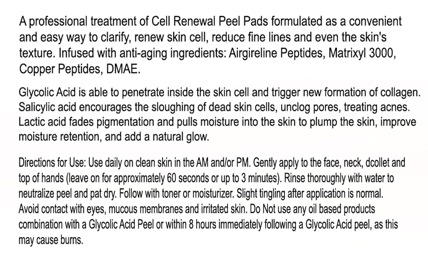 Before and after pictures of Celebrity women used a combination of Glycolic Acid, Salicylic Acid, Argireline Peptides, Hyaluronic Acid and Matrixyl 3000, Copper Peptides, DMAE, Niacin, and the results were really impressive. you will immediately see a change in your skin and an increase in your skin’s radiance and smoothness. Pores will be reduced. Each bottle contains 50 full facial pads/treatments